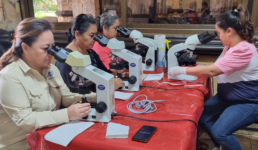 Al mismo tiempo, la licenciada Paula Paniagua, de la Dirección del Laboratorio Nacional de Salud, impartió un taller sobre cómo identificar el parásito en el microscopio, práctica de las pruebas rápidas y la toma de gotas gruesas, las cuales son realizadas por los colaboradores voluntarios, quienes tienen el primer contacto con los migrantes.