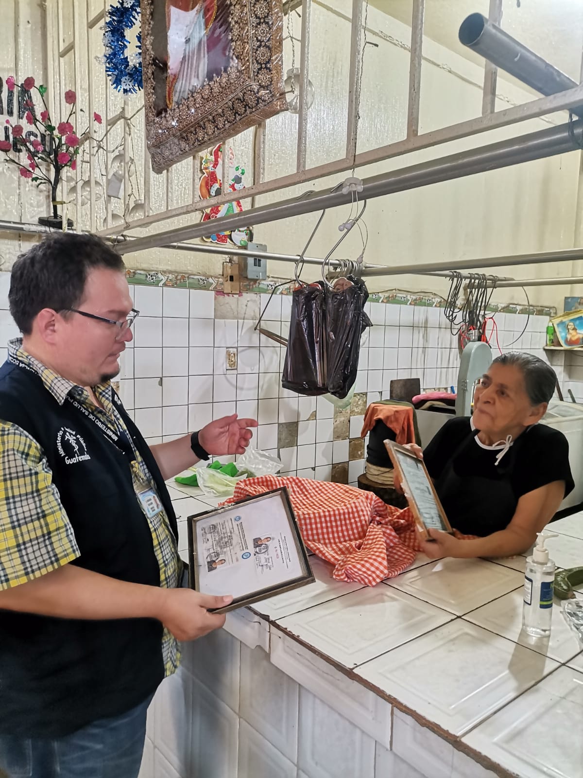 El inspector del Distrito de Salud de ese municipio, Herson Reyes, realizó, como cada día, un recorrido de rutina por la sección de verduras y carnicerías del mercado municipal para verificar que los propietarios cumplan con las medidas de higiene y con los documentos que acrediten su funcionamiento.