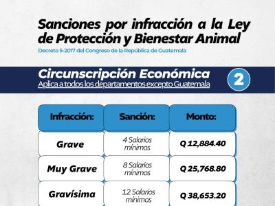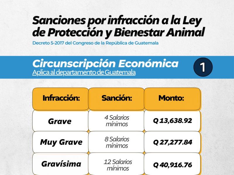 La Ley de Protección y Bienestar Animal, establecida por el Decreto 5-2017 del Congreso de la República, contempla sanciones económicas para las personas que incurran en actos de maltrato, crueldad o negligencia hacia los animales.