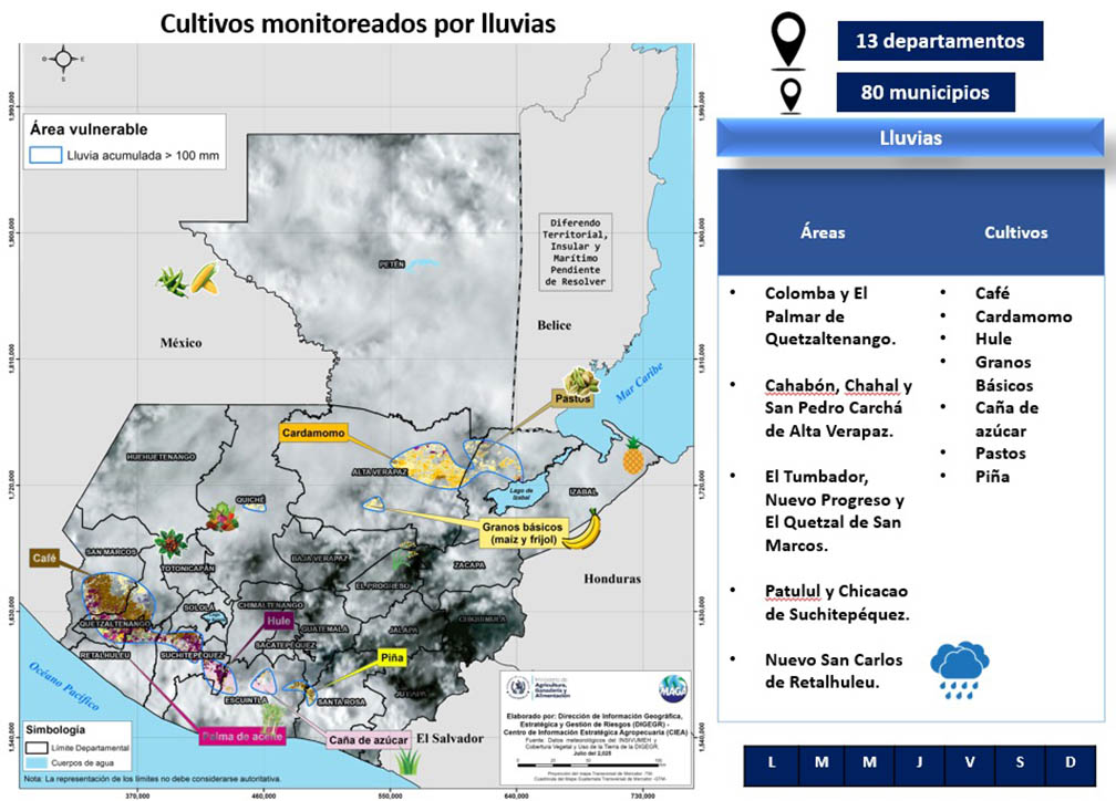 Ante las constantes lluvias y la saturación del suelo, el Ministerio de Agricultura Ganadería y Alimentación (MAGA) por medio del análisis agrometeorológico basado en el pronóstico del Instituto Nacional de Sismología, Vulcanología, Meteorología e Hidrología (INSIVUMEH), monitorea los cultivos en 80 municipios de 13 departamentos del país.
