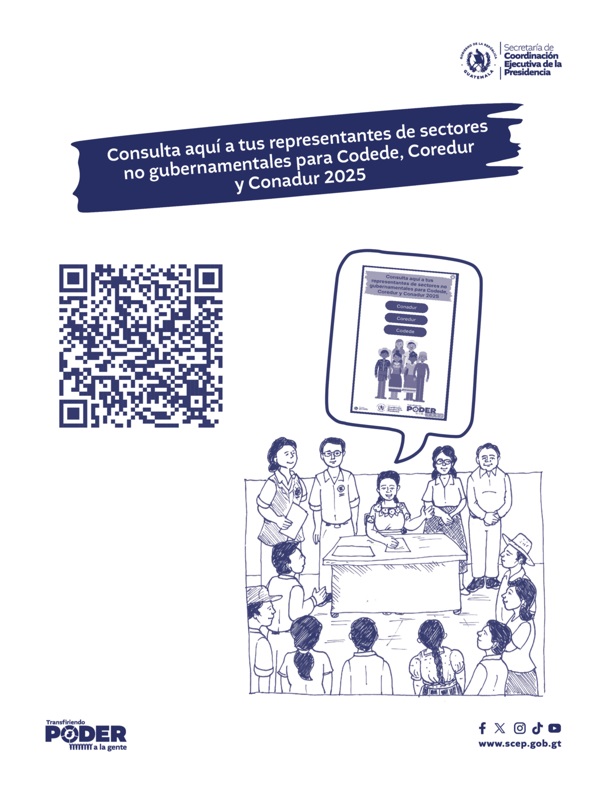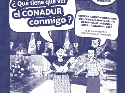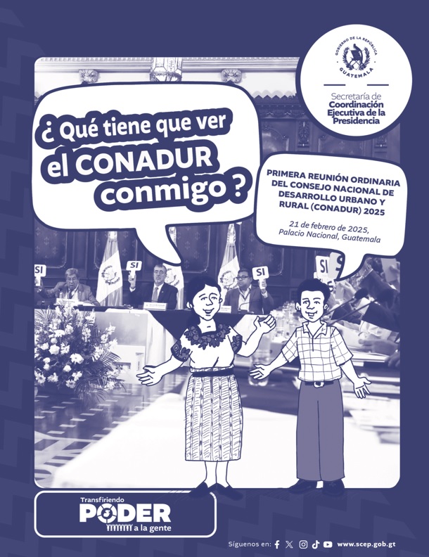Guatemala, 8 de mayo de 2025. La Secretaría de Coordinación Ejecutiva de la Presidencia (SCEP), con la finalidad de promover la participación activa de las comunidades del país; así como fortalecer los procesos de desarrollo local, presenta una serie de materiales diseñados y mediados pedagógicamente con el propósito de recuperar el verdadero sentido que tiene el Consejo Nacional de Desarrollo Urbano y Rural (Conadur).