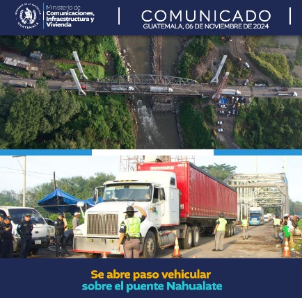 En un esfuerzo en conjunto, con los trabajos complementarios de los empresarios regionales en coordinación con el CIV y la Gobernación Departamental de Suchitepéquez, se ha concluido la fase de trabajos urgentes que permiten la apertura del puente Nahualate.