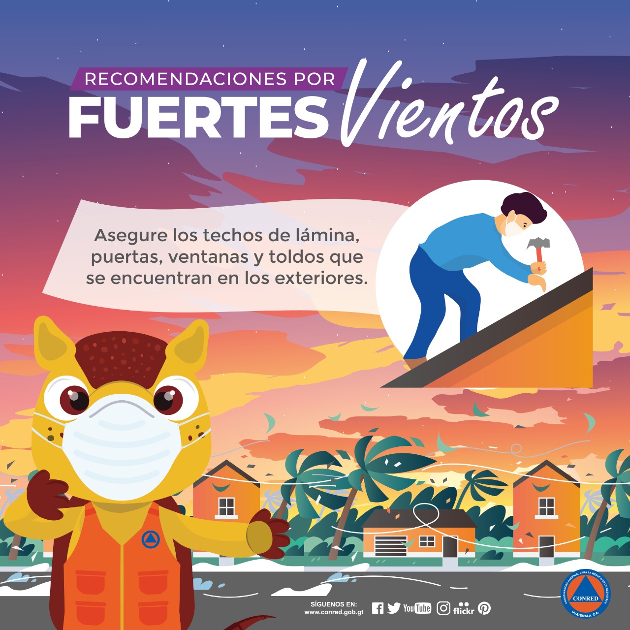 La CONRED, entidad responsable de coordinar con instituciones públicas, instituciones privadas, organismos nacionales, organismos internacionales y sociedad civil en los distintos niveles territoriales y sectoriales la gestión de riesgo a los desastres, esto como estrategia integral que contribuye al desarrollo sostenible de Guatemala, continuará emitiendo recomendaciones a través de sus cuentas oficiales en las distintas redes sociales, CONRED Radio y CONRED Tv.