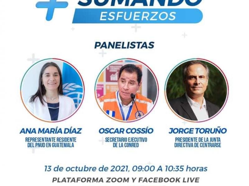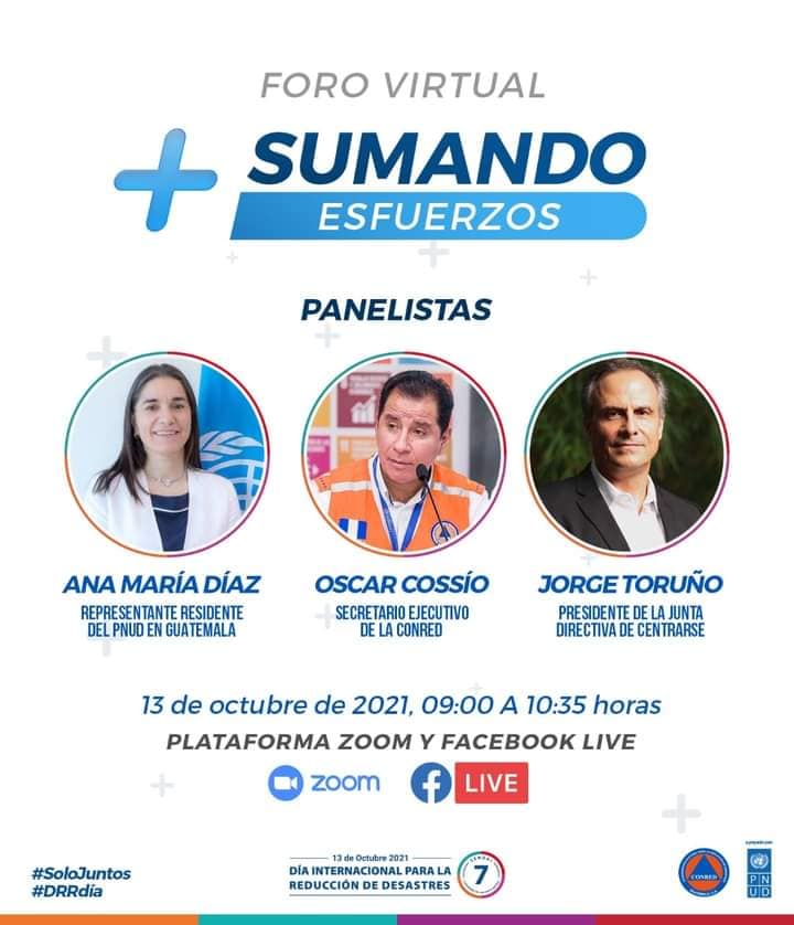Ante el acercamiento del Día Internacional para la Reducción del Riesgo de Desastres, la Secretaría Ejecutiva de la Coordinadora Nacional para la Reducción de Desastres -SE-CONRED- invita a la población en general al foro virtual “Sumando Esfuerzos”, actividad que se desarrollará por Facebook Live (@conredgt) el miércoles 13 de octubre de las 9:00 a las 10:35 horas.
