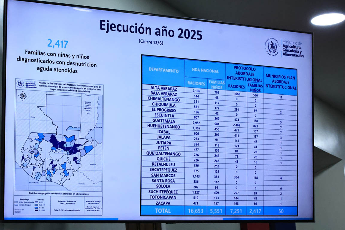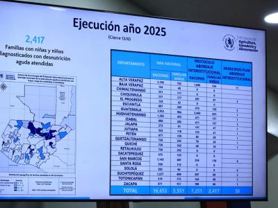 El Ministerio de Agricultura, Ganadería y Alimentación (MAGA), por medio del Viceministerio de Seguridad Alimentaria y Nutricional (VISAN), informó en la quinta reunión extraordinaria del Consejo Nacional de Seguridad Alimentaria y Nutricional (CONASAN), que se alcanzó el 100% de ejecución en las intervenciones de agricultura sensible a la nutrición en los 50 municipios priorizados por altos índices de desnutrición aguda.