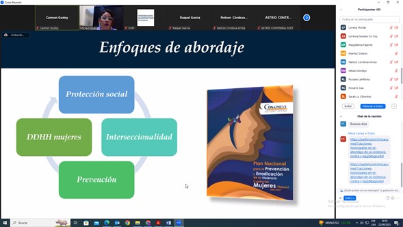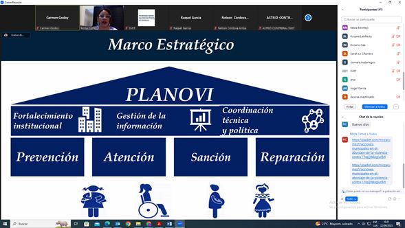 La Secretaría Presidencial de la Mujer por medio de la Coordinadora del Sector Político Estratégico de la Dirección de Gestión de Políticas Públicas para la Equidad entre Hombres y Mujeres Mirza Cumez, participó en el taller de asistencia técnica impartido a la Secretaría Contra la Violencia Sexual Explotación y Trata de Personas SVET , en el que abordó la responsabilidad institucional en el Plan Nacional para la Prevención y Erradicación de la Violencia Contra las Mujeres Planovi 2020-2029, situación de violencia sexual, el marco de compromisos internacionales y nacionales en la materia, líneas estratégicas, ejes y enfoques del Planovi 2020-2029.