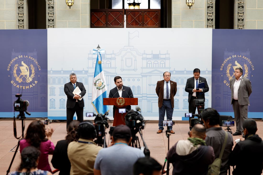 Secretario de Comunicación, Santiago Palomo, junto con el Ministro de Energía y Minas, Víctor Ventura; así como el Secretario de Planificación y Programación de la Presidencia (Segeplán) Carlos Mendoza, el Director Ejecutivo de la Comisión Nacional contra la Corrupción Julio Flores, y el auditor del Instituto Nacional de Electrificación (INDE), Jorge García, ofrecieron conferencia de prensa en el Patio de La Paz del Palacio Nacional de la Cultura.