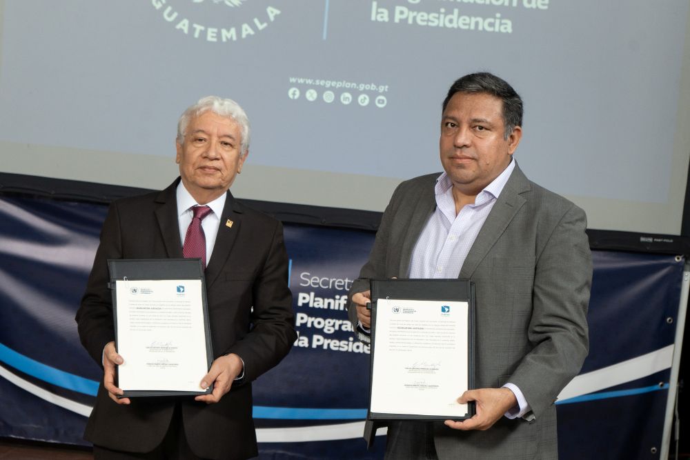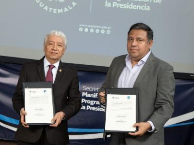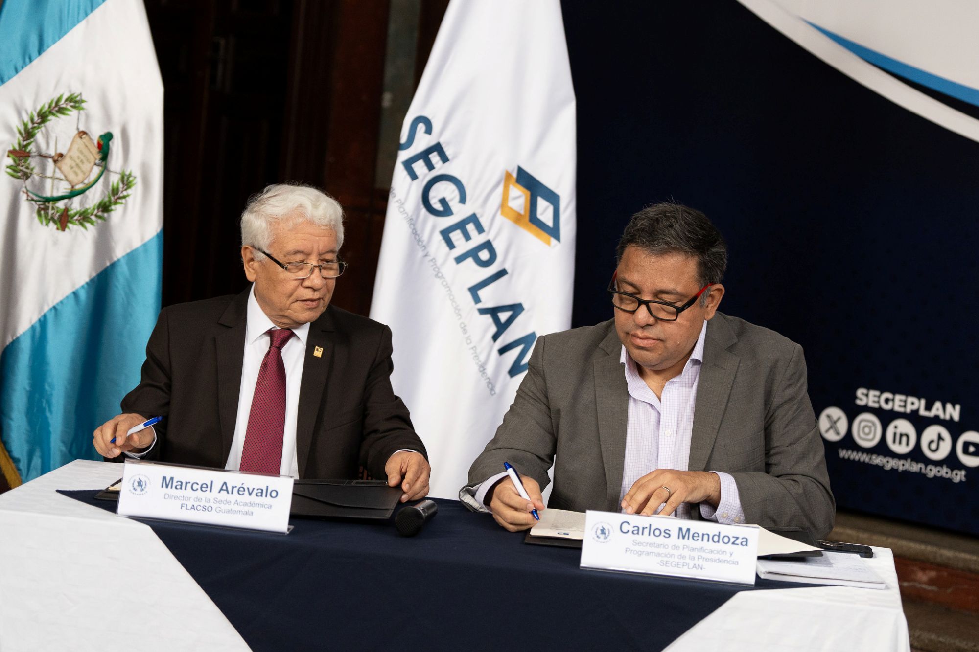 La suscripción del documento estuvo a cargo de Carlos Mendoza, titular de la SEGEPLAN, y Marcel Arévalo Quinteros, director de la sede Académica de FLACSCO Guatemala. Mendoza agradeció la disposición de FLACSO para colaborar con esta iniciativa de Gobierno.