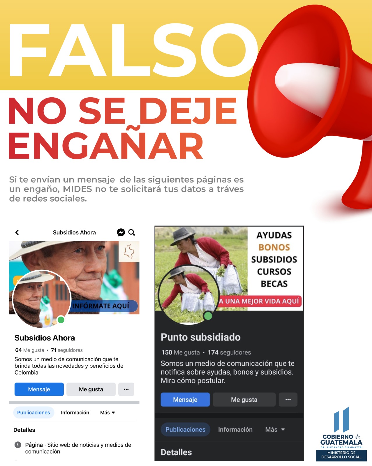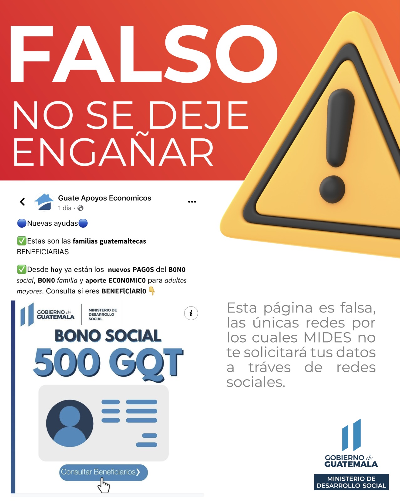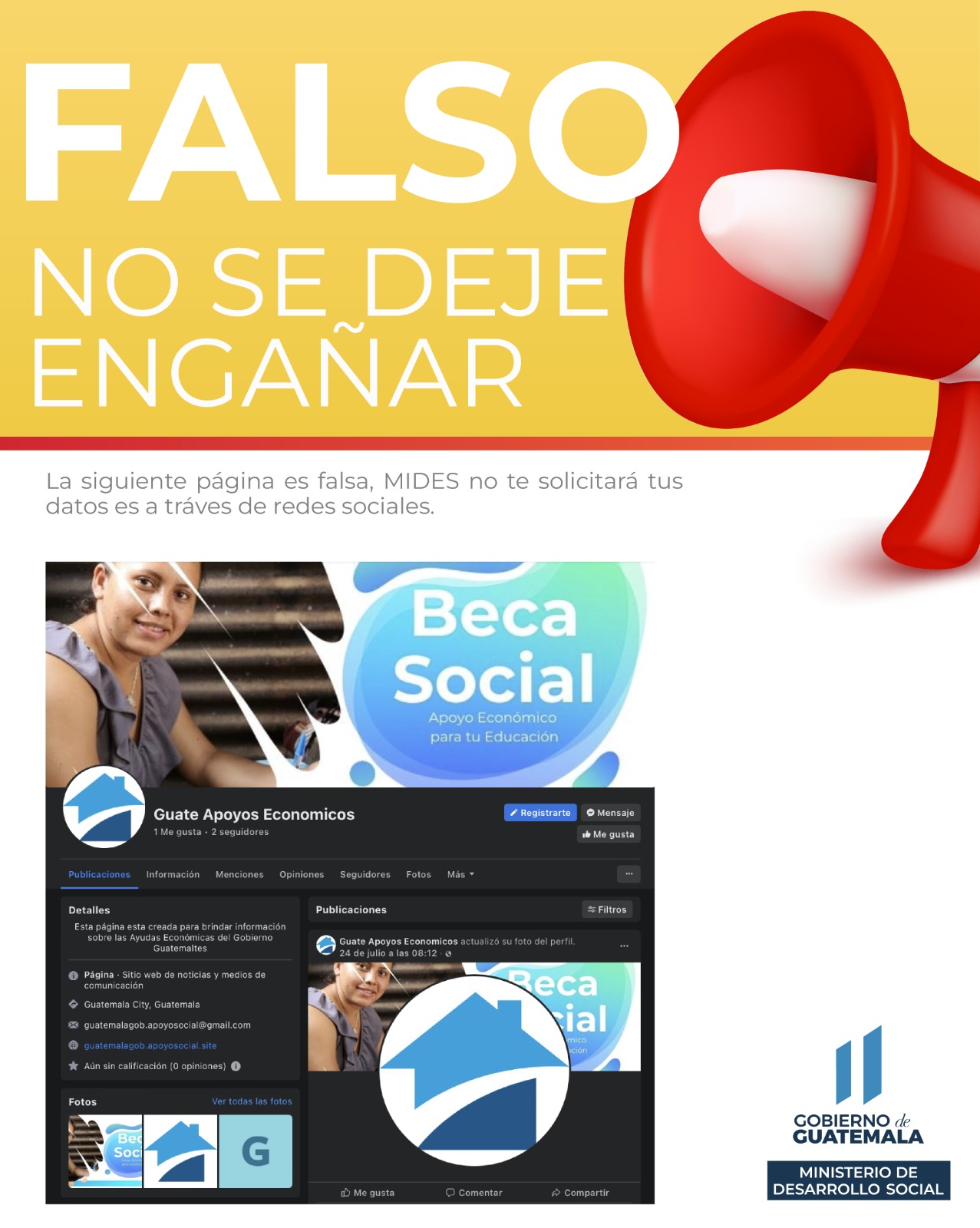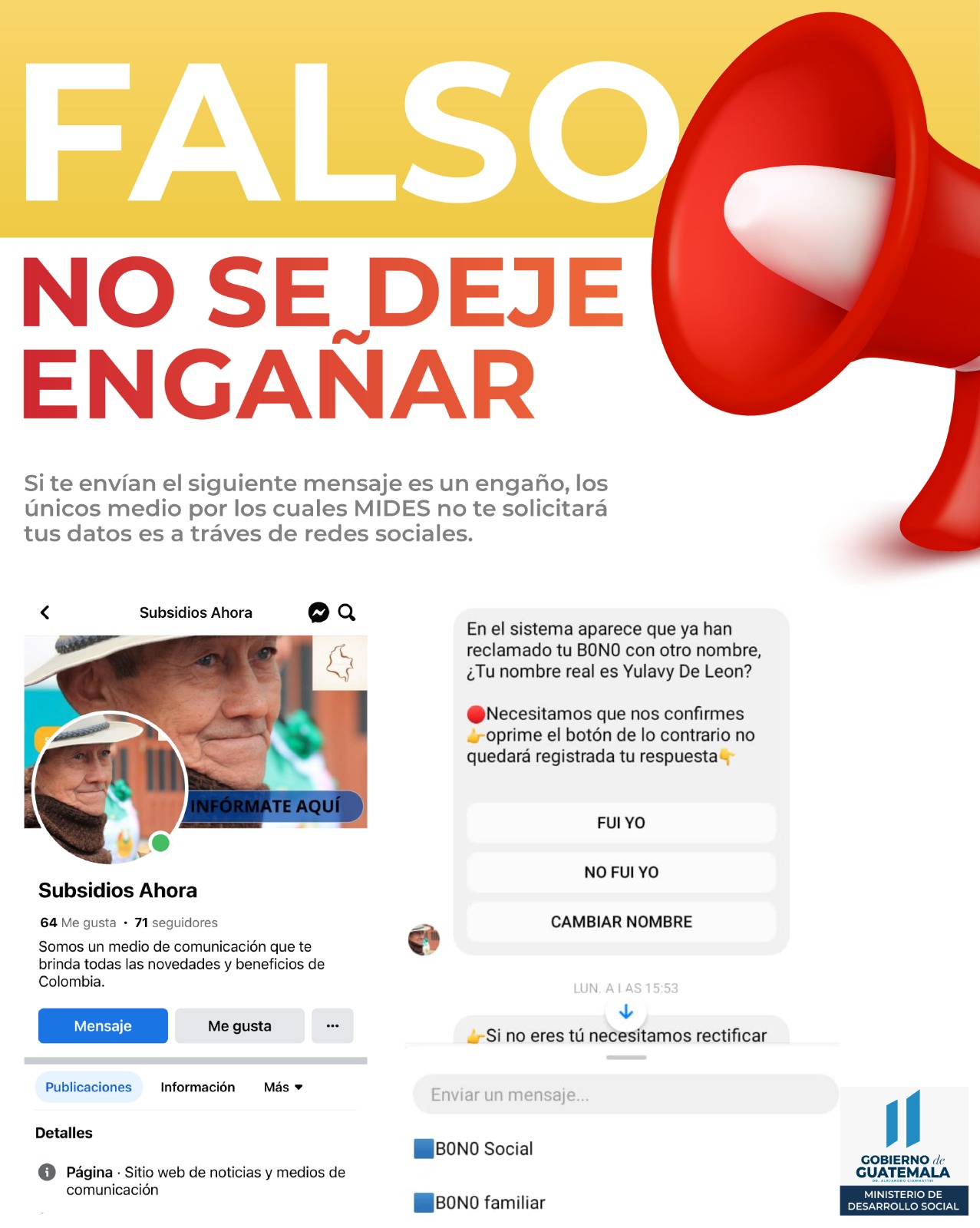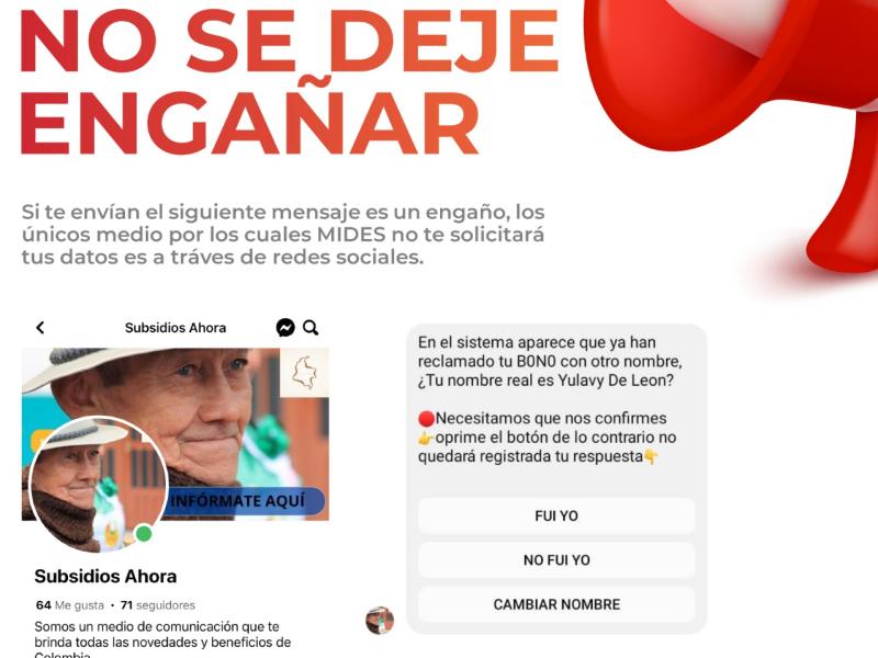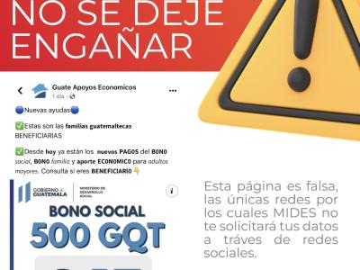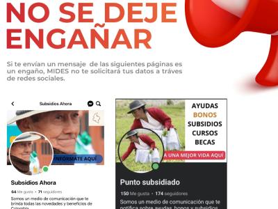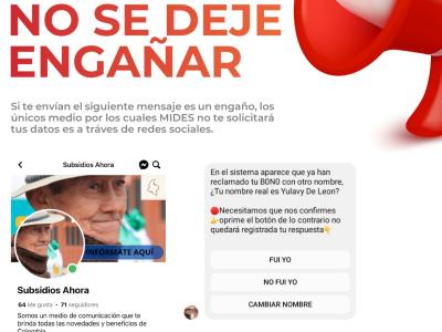 Hacemos un llamado a la población para no dejarse engañar a través de publicaciones digitales falsas, donde te solicitan datos e información personal, en MIDES NO SOLICITAMOS INFORMACIÓN A TRAVÉS DE REDES SOCIALES.