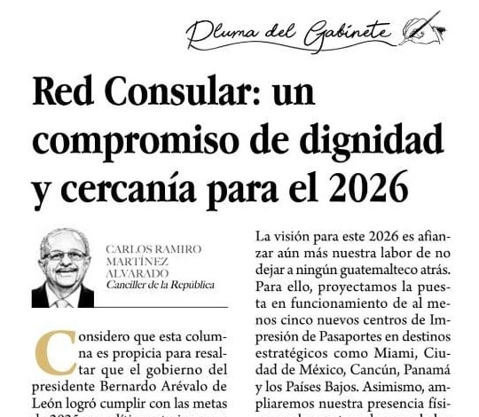 En la sexta columna de opinión publicada por el Diario de Centro América, el Canciller Carlos Ramiro Martínez resalta el fortalecimiento de la Red Consular como un compromiso del Estado con la dignidad, cercanía y atención humana a los guatemaltecos en el exterior.