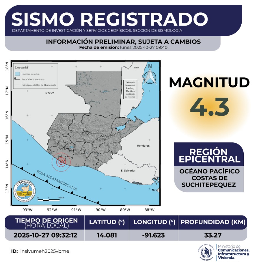 El Instituto Nacional de Sismología, Vulcanología, Meteorología e Hidrología (INSIVUMEH) informó sobre un sismo registrado el 27 de octubre de 2025 a las 09:32:12 horas, con epicentro en el Océano Pacífico, frente a las costas de Suchitepéquez.