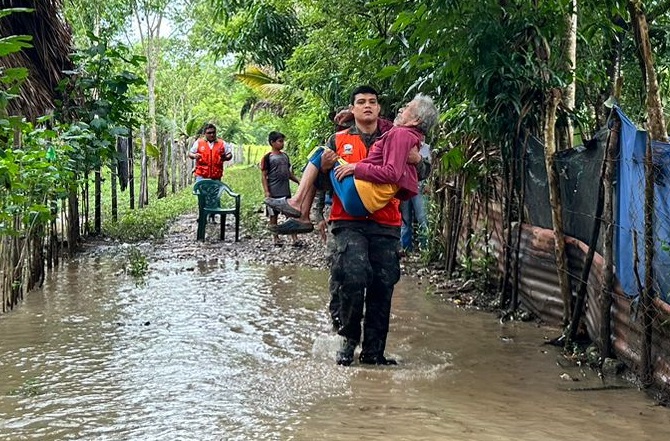 Como parte de las acciones que se realizan en respuesta a los daños ocasionados por inundaciones, rescatistas de la Brigada Humanitaria y de Rescate del Ejército de Guatemala (BHR), contribuyeron en la evacuación de las familias que resultaron damnificadas en el Barrio Buena Vista, Santa Ana, Petén. Además, los rescatistas de la BHR, en coordinación con la Coordinadora Nacional para la Reducción de Desastres (CONRED) y autoridades de la municipalidad de San Antonio, Suchitepéquez, trabajaron de manera conjunta en la limpieza y remoción de escombros en el puente tipo badén que se vio afectado por la crecida del río Chichoy, en el sector Vino Nuevo de la aldea el Triunfo.