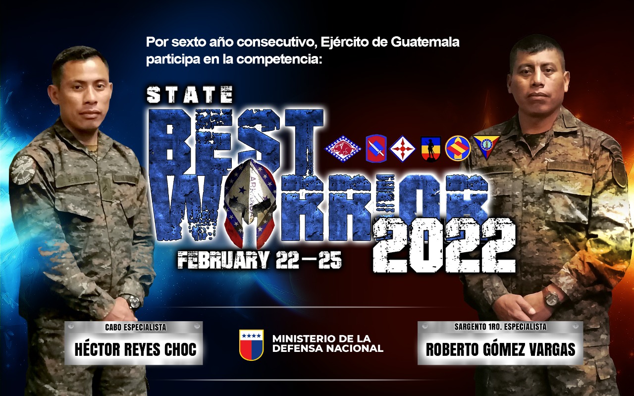 Del 22 al 25 de febrero, se desarrolla la competencia anual “Best Warrior” (Mejor Guerrero), organizada por la Guardia Nacional de Arkansas del Ejército de los Estados Unidos de América, en la que participa el Ejército de Guatemala por sexto año consecutivo a través de una delegación integrada por el Cabo Especialista Héctor Reyes Choc y el Sargento Primero Especialista Roberto Gómez Vargas, quienes fueron seleccionados entre las filas de las Fuerzas de Tierra por su destacado desempeño.