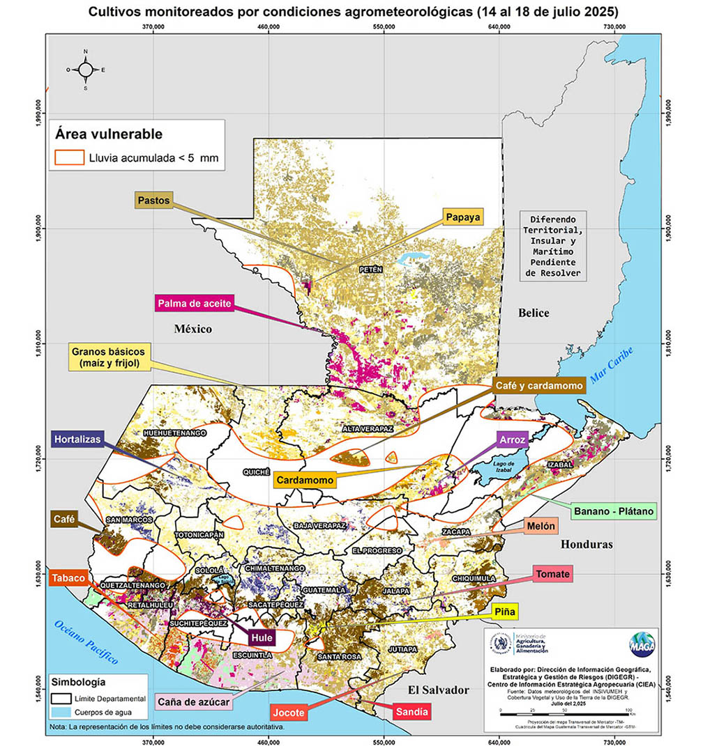 Ante la ausencia de lluvias, se monitorean 320 municipios en los 22 departamentos del país. El Viceministerio de Desarrollo Económico Rural recomienda al sector agrícola, aplicar prácticas de conservación de humedad, como el acolchado con residuos vegetales (hojas secas, paja o rastrojo) para reducir la evaporación en cultivos establecidos.