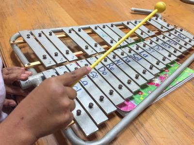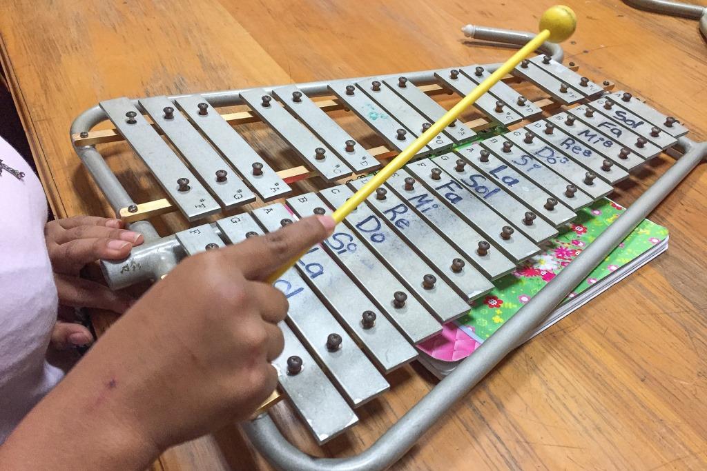 Al continuar el recorrido nos encontramos con el profe Christian. En su salón las liras, el xilófono y la melódica eran interpretadas por pequeñas manos. Su pasión por enseñar música es evidente y con mucha emoción contó que ya están ensayando para la presentación de villancicos de fin de año, en donde participarán el coro, la banda y quienes interpretan la guitarra y el teclado. “Ahora son 46 las niñas y niños que están recibiendo clases de música”, expresó.