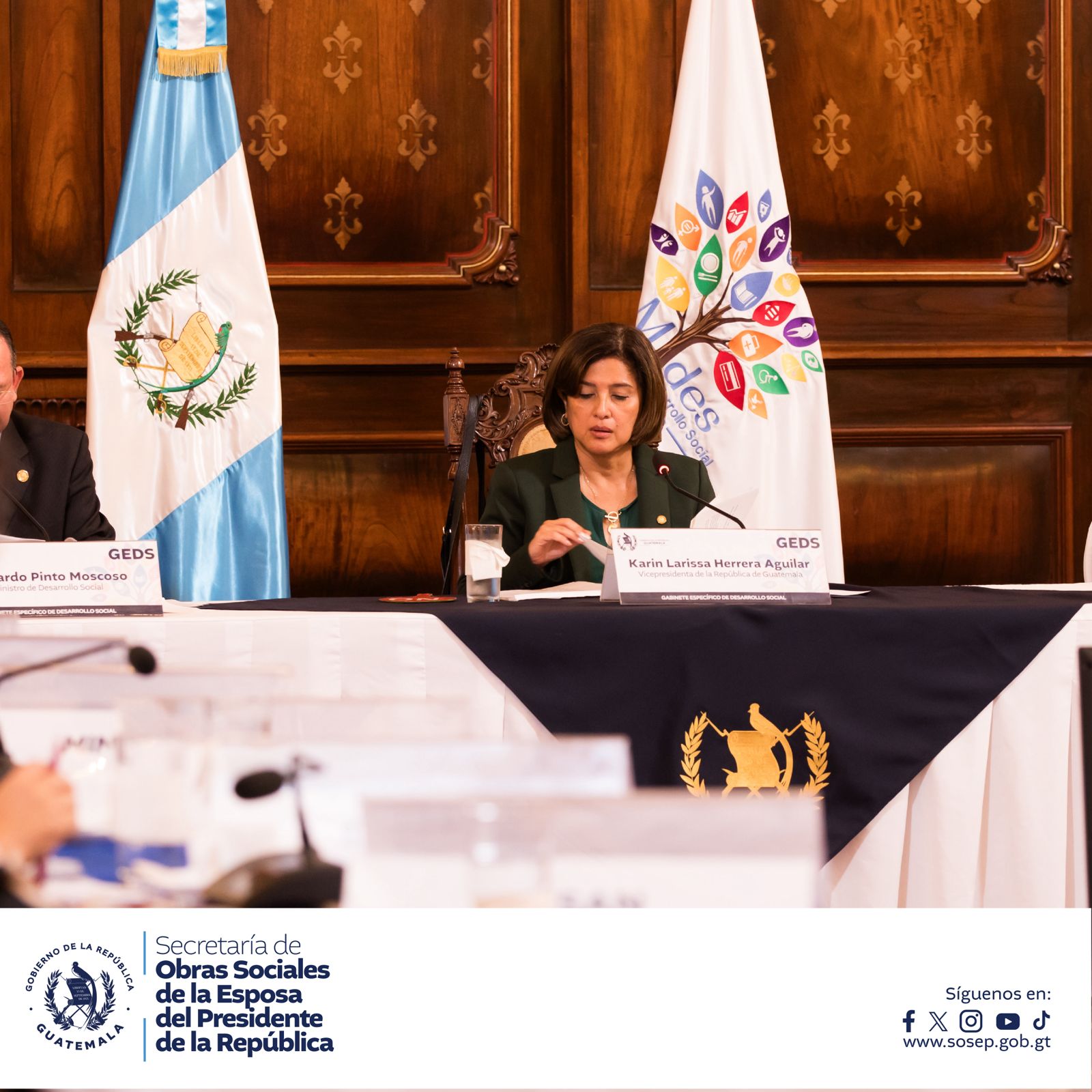 La cuarta reunión ordinaria del Gabinete Especifico de Desarrollo Social (GEDS) se realzo este día, presidida por la vicepresidenta de la República, Karin Herrera, y el Coordinador Técnico, ministro de Desarrollo Social, Abelardo Pinto, también participo la Secretaria de SOSEP Dra. Zulma Calderón.