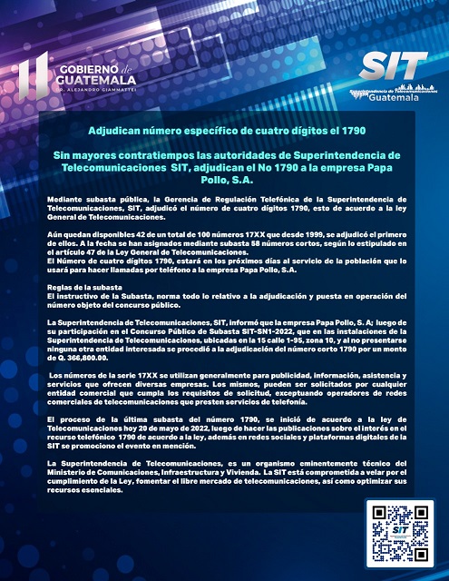 La Superintendencia de Telecomunicaciones, SIT, informó que la empresa Papa Pollo, S. A; luego de su participación en el Concurso Público de Subasta SIT-SN1-2022, que en las instalaciones de la Superintendencia de Telecomunicaciones, ubicadas en la 15 calle 1-95, zona 10, y al no presentarse ninguna otra entidad interesada se procedió a la adjudicación del número corto 1790 por un monto de Q. 366,800.00.