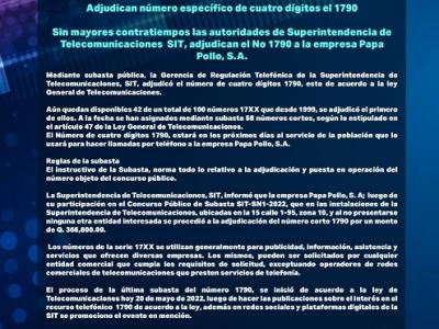 Mediante subasta pública, la Gerencia de Regulación Telefónica de la Superintendencia de Telecomunicaciones, SIT, adjudicó el número de cuatro dígitos 1790, esto de acuerdo a la ley General de Telecomunicaciones.