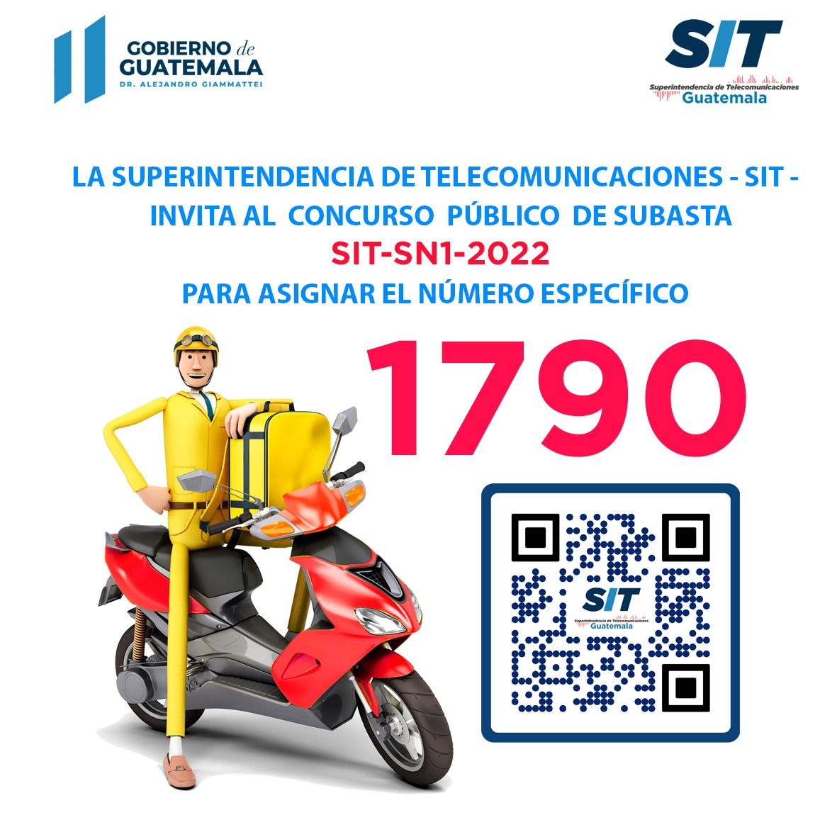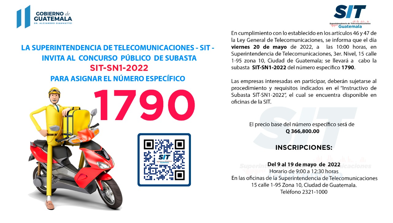 En cumplimiento con lo establecido en los artículos 46 y 47 de la Ley de Telecomunicaciones, se informa que el día vienes 20 de mayo de 2022, a las 10:00 horas en la sede de la Superintendencia de Telecomunicaciones, salón del tercer nivel, ubicada en la 15 calle 1-95, zona 10 de la ciudad capital, se llevará a cabo la subasta SIT-SN1-2022, para asignar al mejor postor el número específico 1790.