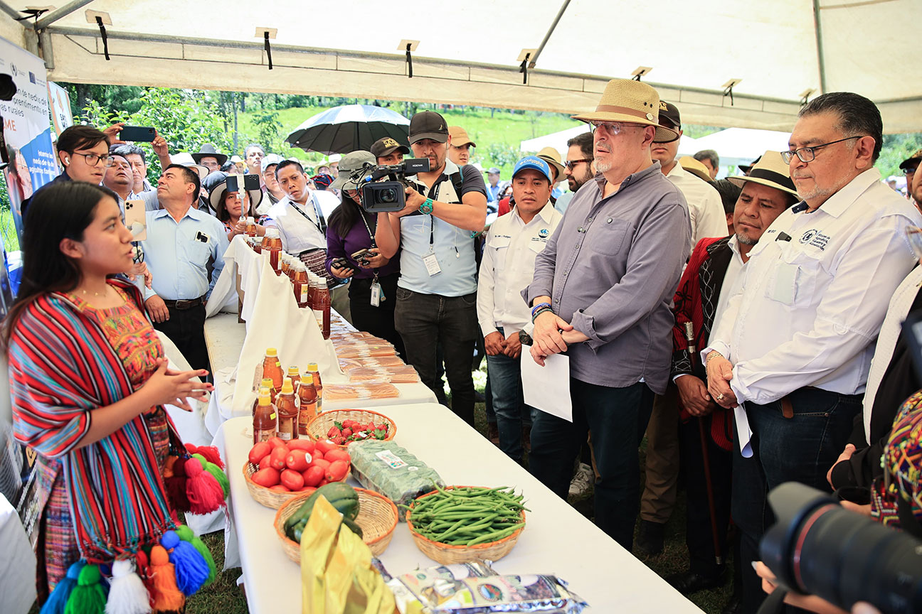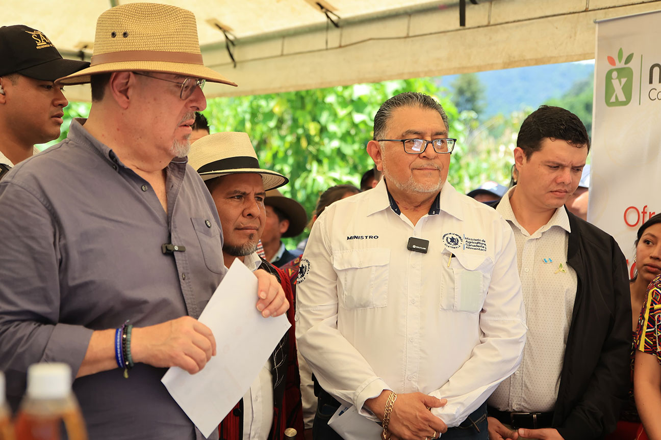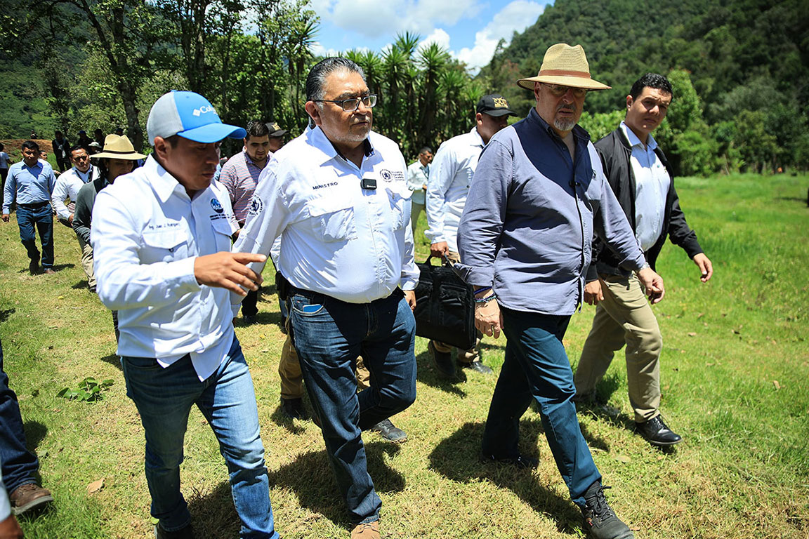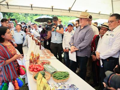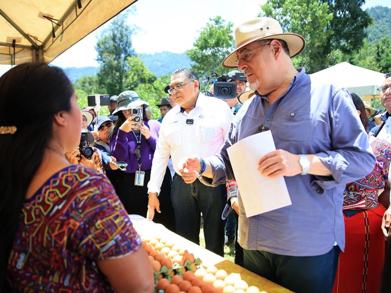 El presidente de la República, Bernardo Arévalo y el ministro de Agricultura, Ganadería y Alimentación, Mynor Estrada, acompañados por la representante adjunta de FAO en Guatemala, Luisa Samayoa, visitaron la aldea Xexuxcap, municipio de Santa María Nebaj, Quiché, para conocer y apreciar los avances de proyectos enfocados en la seguridad alimentaria y el desarrollo rural.
