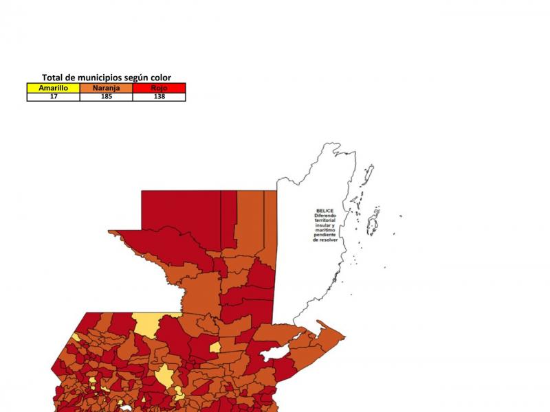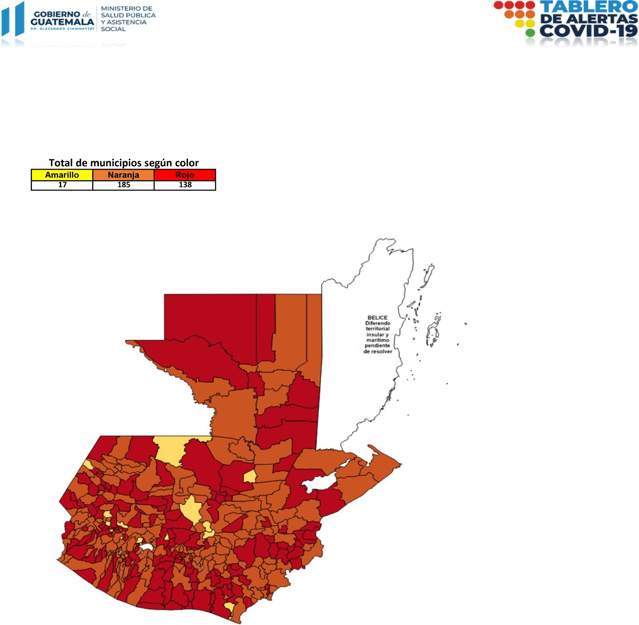 El Ministerio de Salud Pública y Asistencia Social -MSPAS- actualizó el Tablero de Alertas Sanitarias COVID-19; para los próximos 14 días se establece 138 municipios en alerta roja, 185 en naranja y 17 en amarilla.