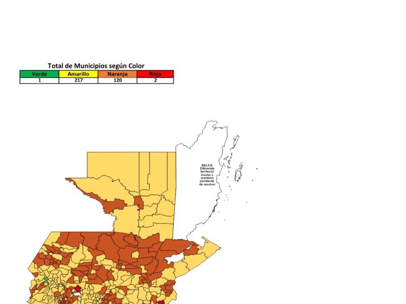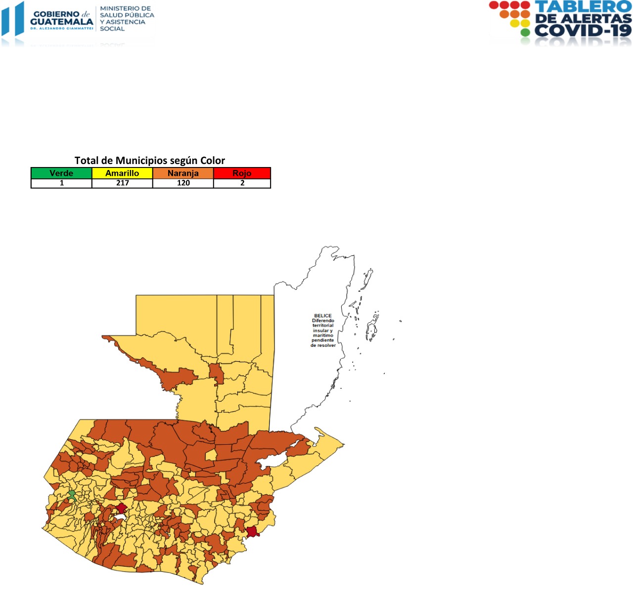 El Ministerio de Salud Pública y Asistencia Social -MSPAS- actualizó el Tablero de Alertas Sanitarias COVID-19; para los próximos 14 días se establece 2 municipios en alerta roja, 120 en naranja, 217 en amarilla y 1 en verde