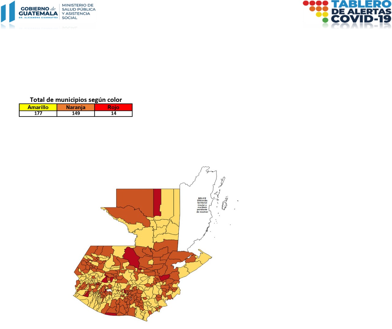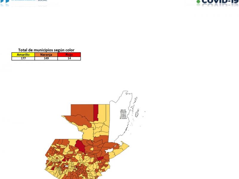 El Ministerio de Salud Pública y Asistencia Social -MSPAS- actualizó el Tablero de Alertas Sanitarias COVID-19; para los próximos 14 días se establece 14 municipios en alerta roja, 149 en naranja y 177 en amarilla.