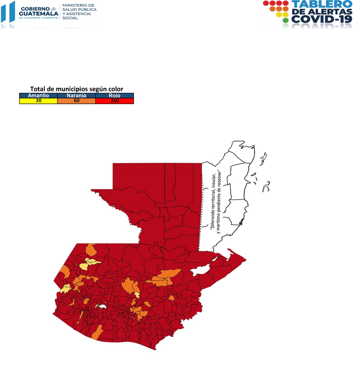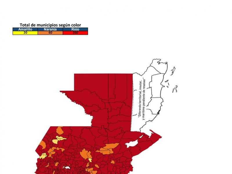El Ministerio de Salud Pública y Asistencia Social -MSPAS- actualizó el Tablero de Alertas Sanitarias COVID-19; para los próximos 14 días se establece 260 municipios en alerta roja, 60 en naranja y 20 en amarilla