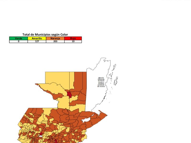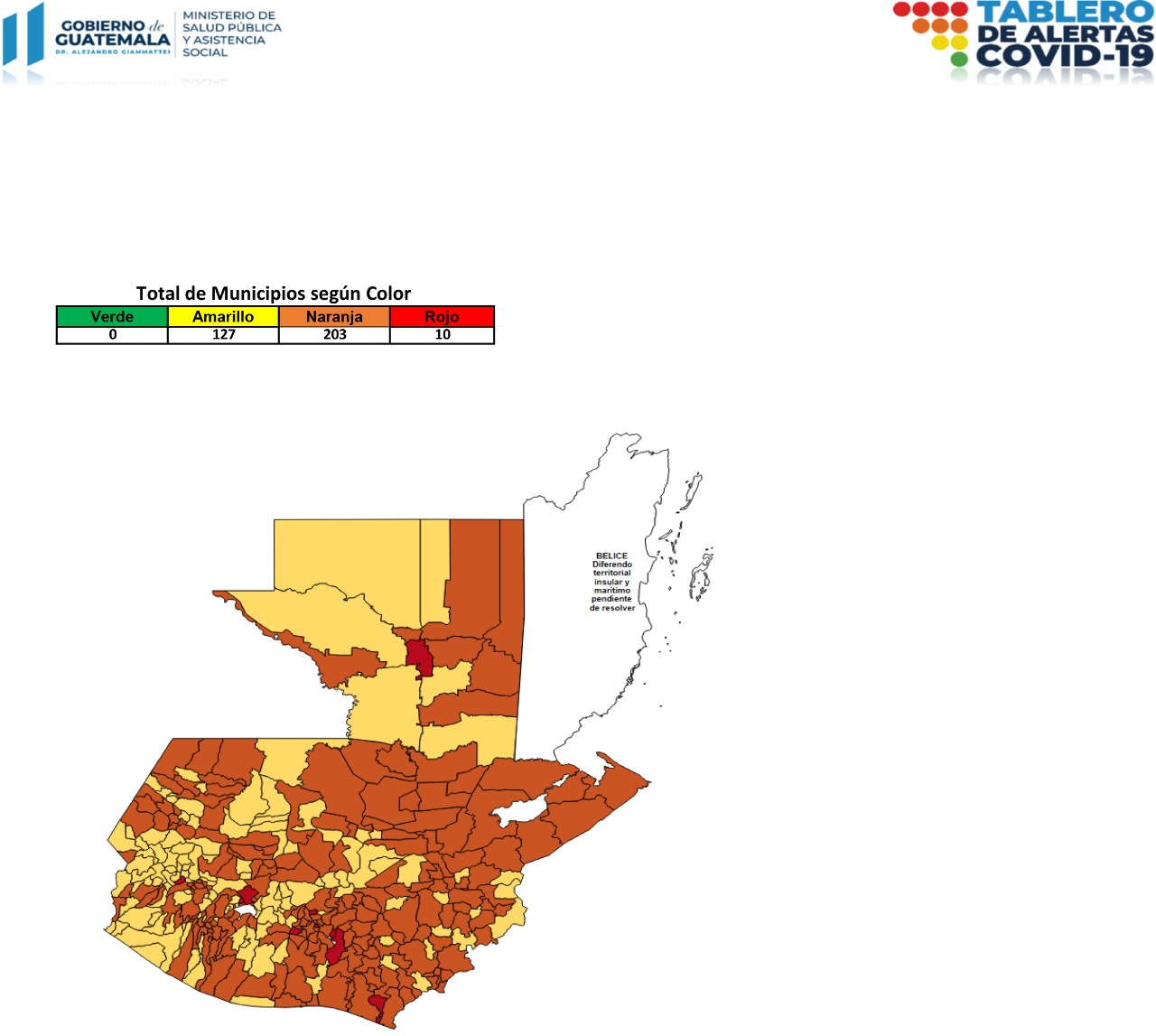 El Ministerio de Salud Pública y Asistencia Social -MSPAS- actualizó el Tablero de Alertas Sanitarias COVID-19; para los próximos 14 días se establece 10 municipios en alerta roja, 203 en naranja y 127 en amarilla.