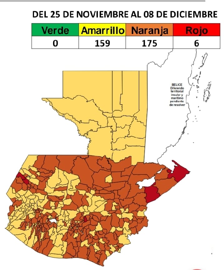 El Ministerio de Salud Pública y Asistencia Social -MSPAS- actualizó el Tablero de Alertas Sanitarias COVID-19; para los próximos 14 días se establece 6 municipios en alerta roja, 175 en alerta naranja y159 en amarilla