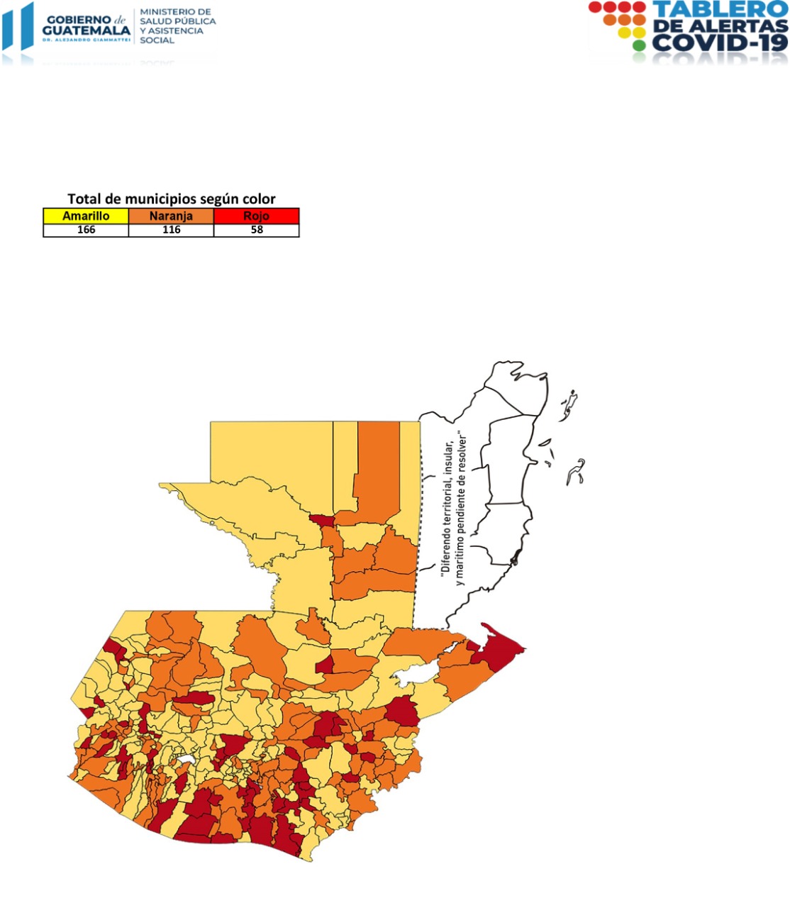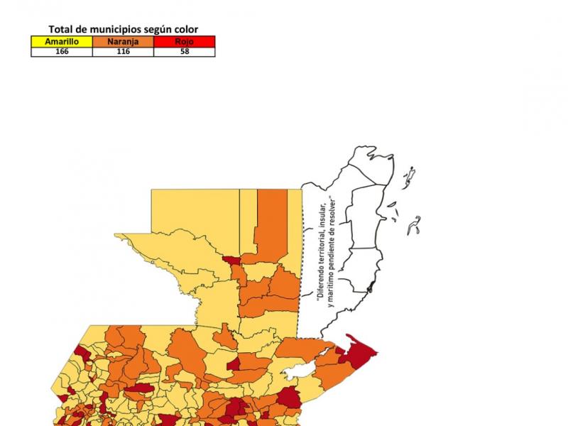 El Ministerio de Salud Pública y Asistencia Social -MSPAS- actualizó el Tablero de Alertas Sanitarias COVID-19; para los próximos 14 días se establece 58 municipios en alerta roja, 116 en naranja y 166 en amarilla