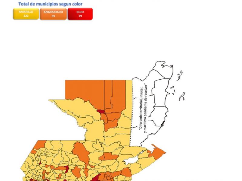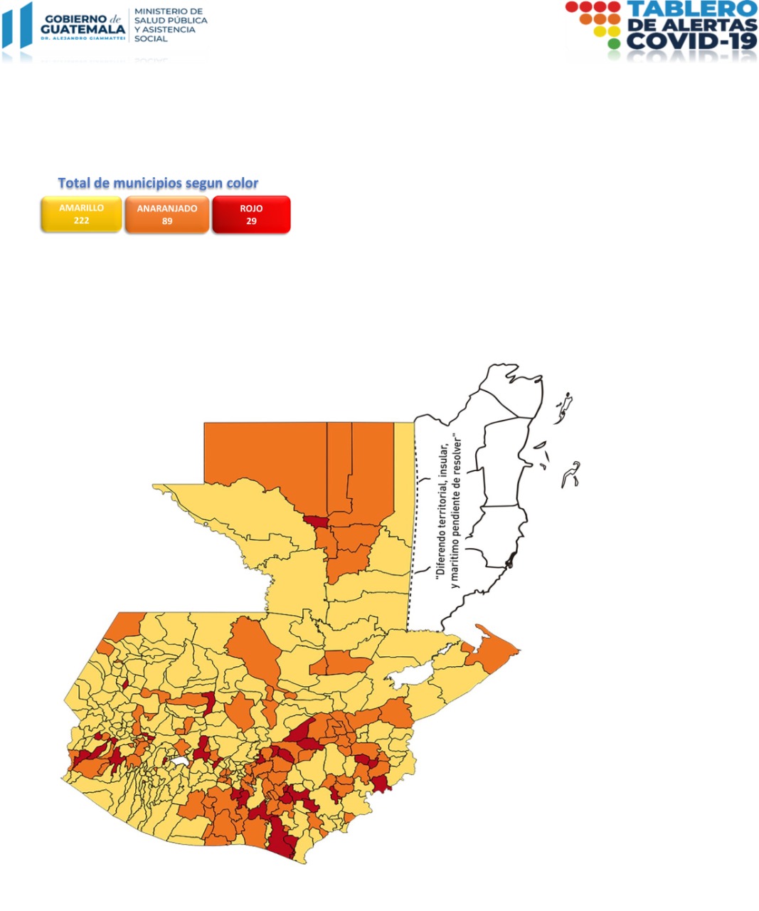 El Ministerio de Salud Pública y Asistencia Social -MSPAS- actualizó el Tablero de Alertas Sanitarias COVID-19; para los próximos 14 días se establece 29 municipios en alerta roja, 89 en naranja y 222 en amarilla