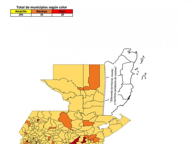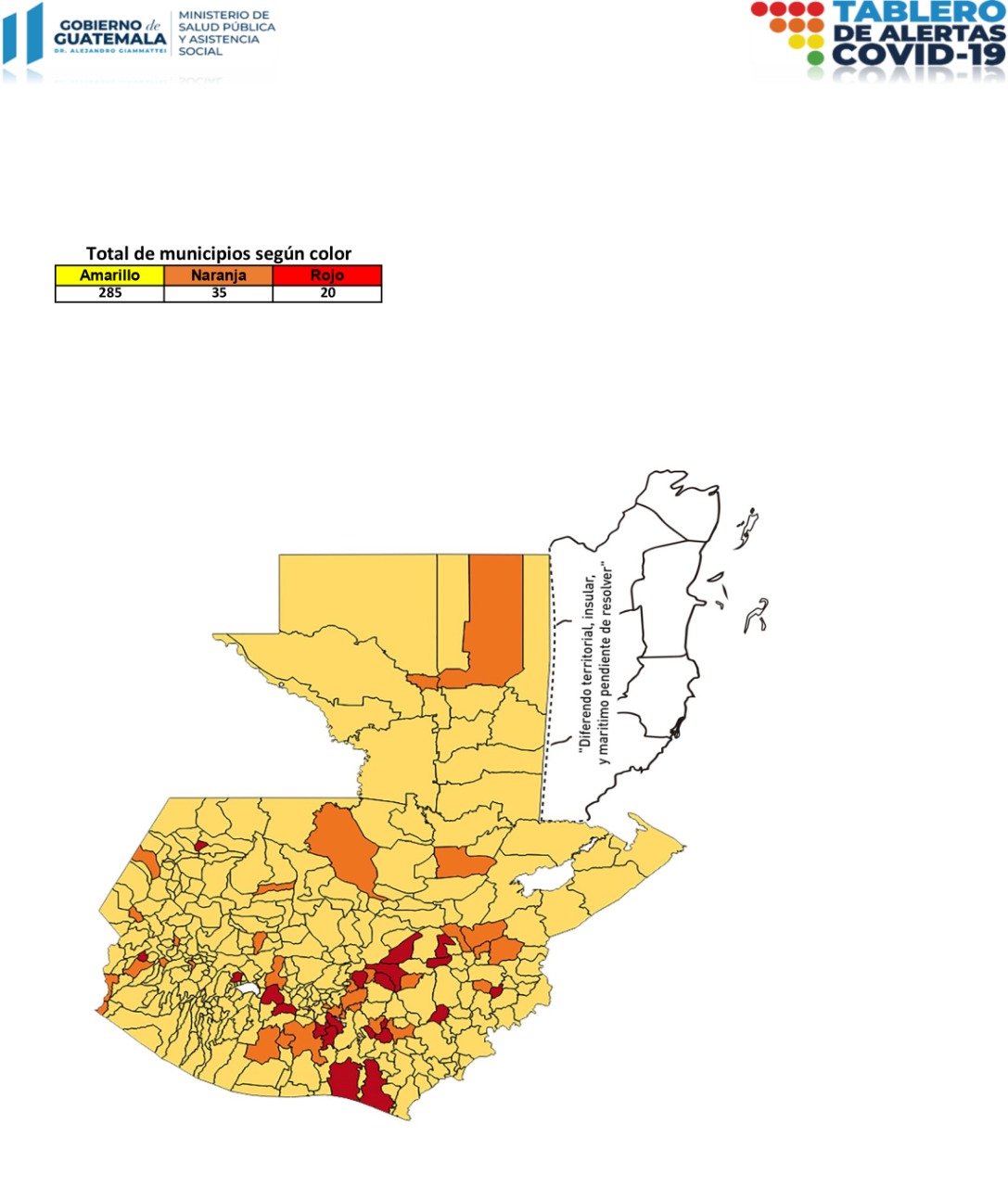 El Ministerio de Salud Pública y Asistencia Social -MSPAS- actualizó el Tablero de Alertas Sanitarias COVID-19; para los próximos 14 días se establece 20 municipios en alerta roja, 35 en naranja y 285 en amarilla