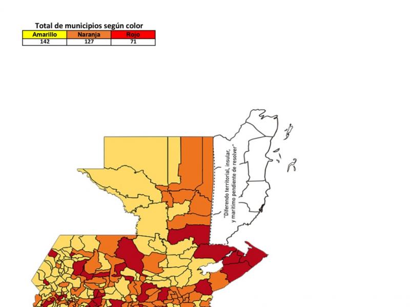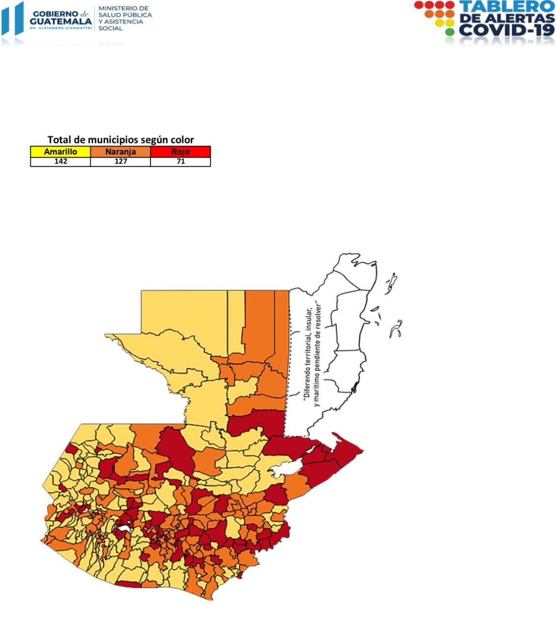 El Ministerio de Salud Pública y Asistencia Social -MSPAS- actualizó el Tablero de Alertas Sanitarias COVID-19; para los próximos 14 días se establece 71 municipios en alerta roja, 127 en naranja y 142 en amarilla.