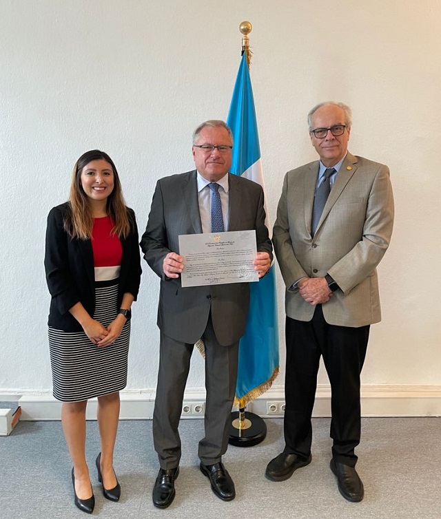 El nuevo cónsul honorario expresó su profundo agradecimiento al Gobierno de Guatemala, al Ministerio de Relaciones Exteriores y a la Embajada de Guatemala en Alemania por su designación, y reiteró su compromiso de trabajar activamente para avanzar en los temas prioritarios de la agenda bilateral, con el fin de impulsar proyectos de desarrollo económico, inversión y turismo.