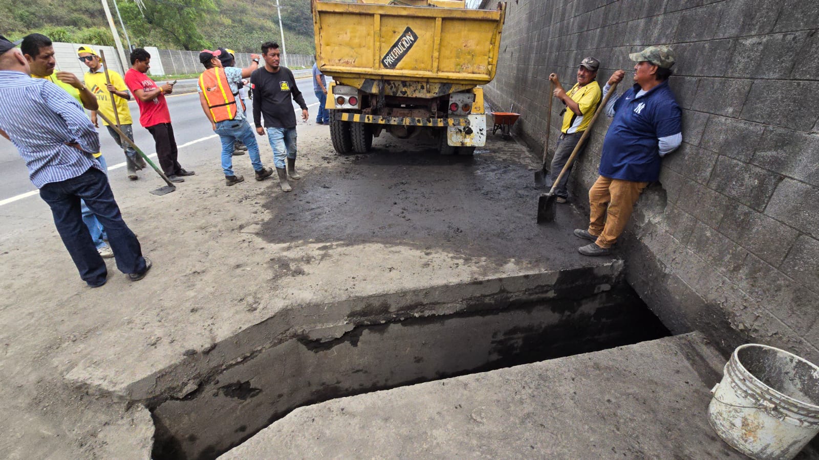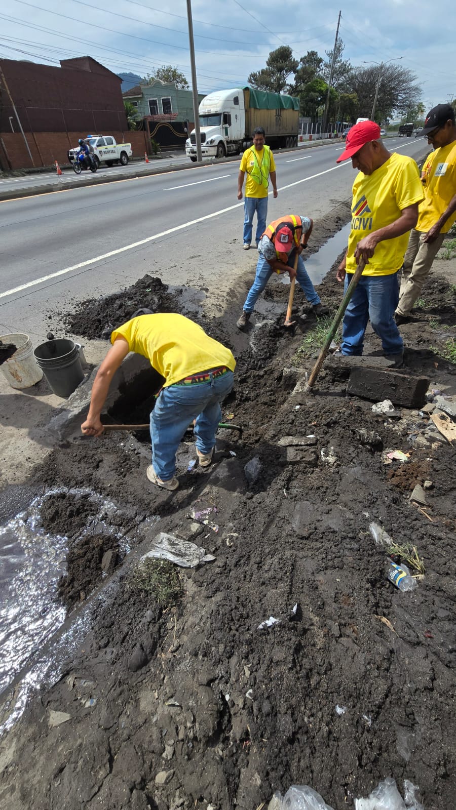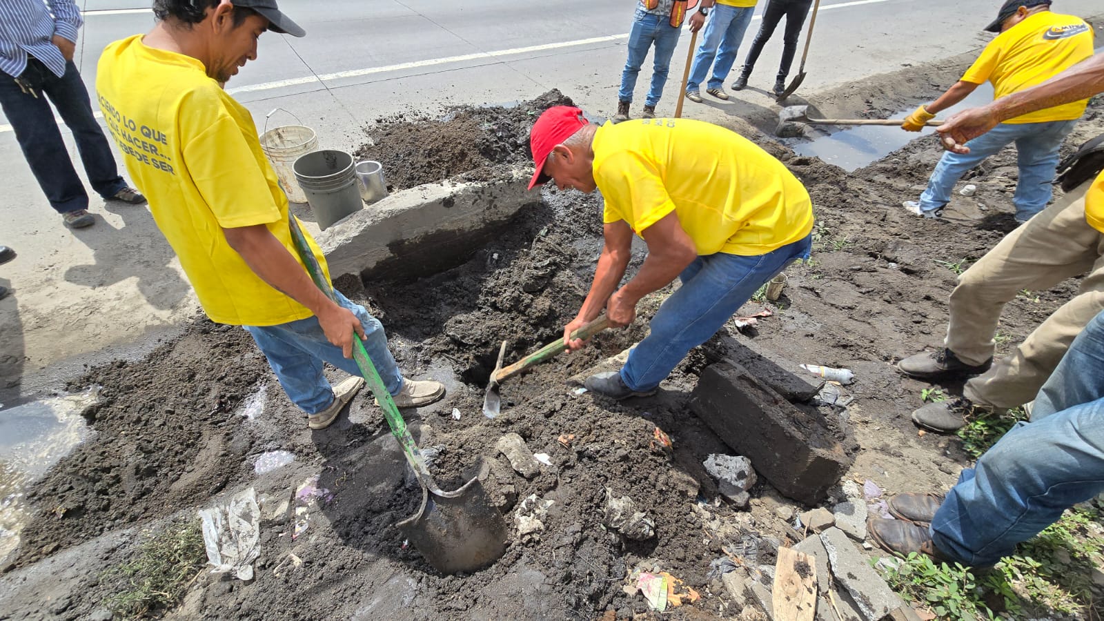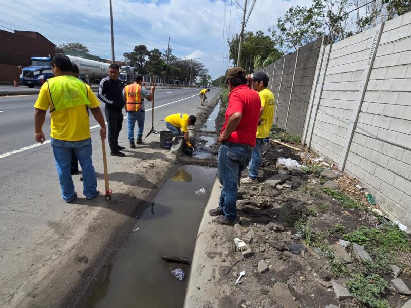 Para mejorar la circulación vehicular en El Cafetal, Palín, Escuintla, sobre la CA-9 Sur, personal de la Zona Vial 3 de Escuintla y la Sección de Asfaltos de Amatitlán, de la Dirección General de Caminos, realizan trabajos de limpieza para prevenir el colapso de drenajes.