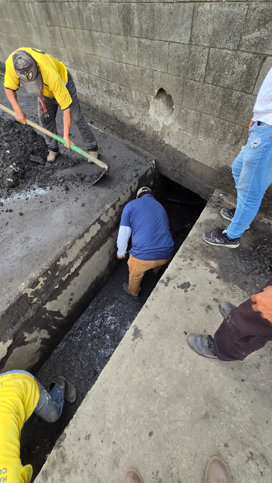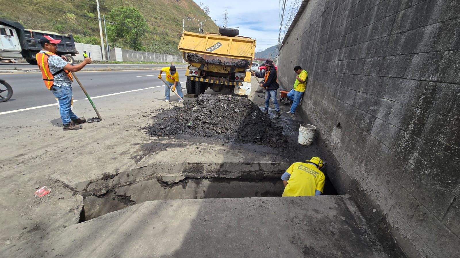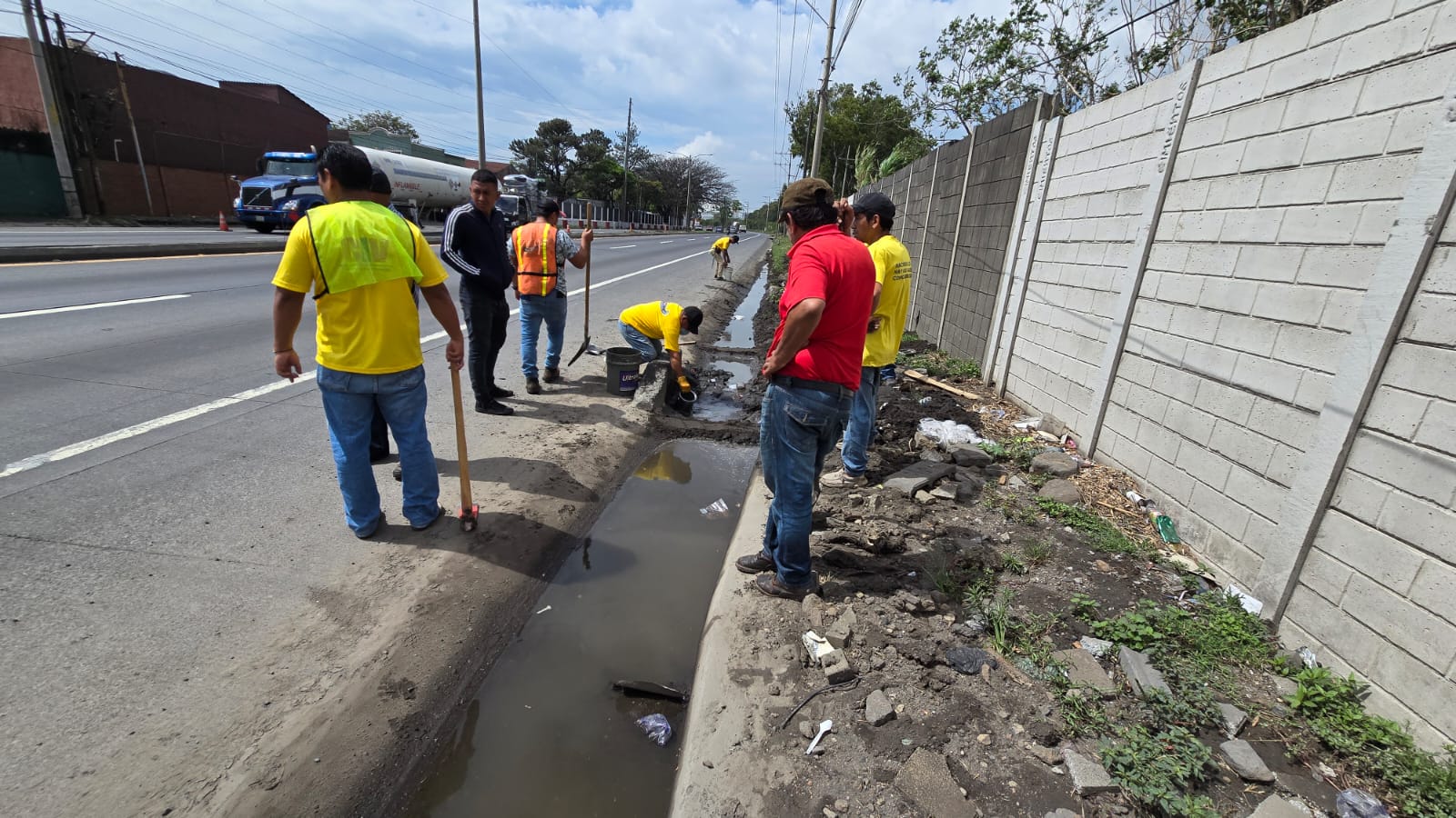 Para mejorar la circulación vehicular en El Cafetal, Palín, Escuintla, sobre la CA-9 Sur, personal de la Zona Vial 3 de Escuintla y la Sección de Asfaltos de Amatitlán, de la Dirección General de Caminos, realizan trabajos de limpieza para prevenir el colapso de drenajes.