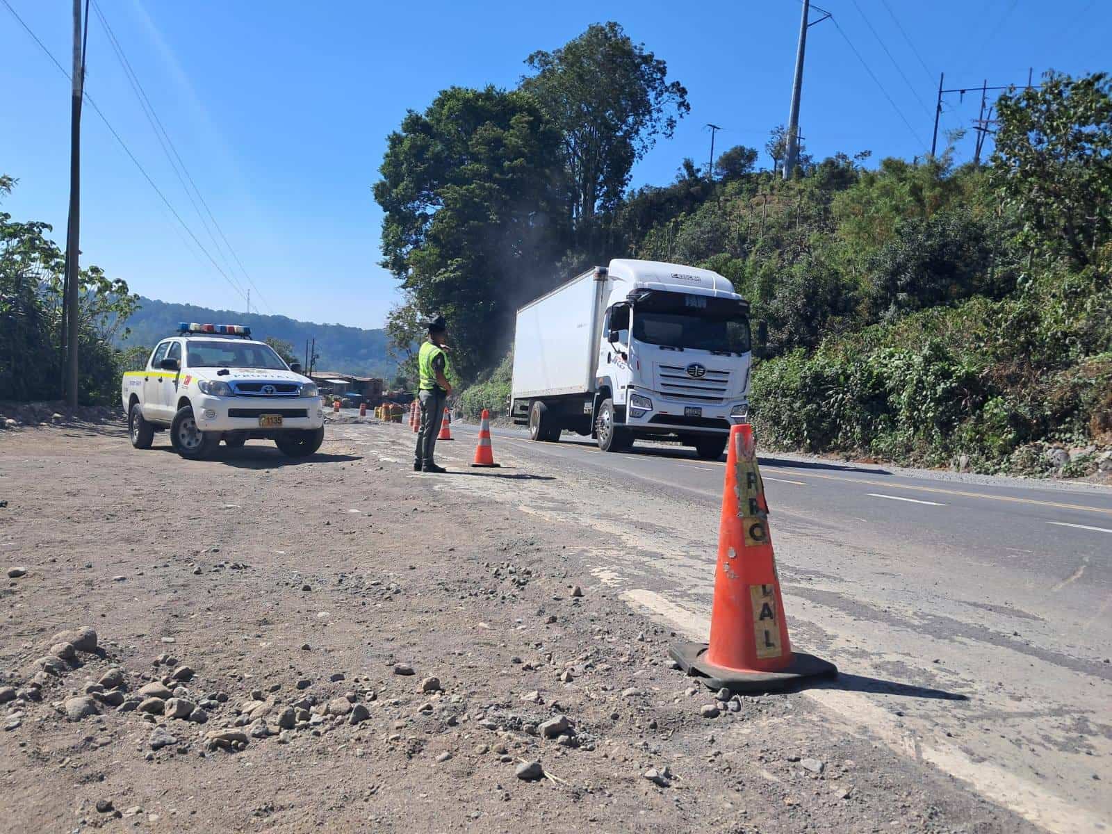 Brigadas de la Dirección General de Protección y Seguridad Vial (Provial) brindan seguridad vial y regulan el tránsito debido a trabajos en carretera en el km 194 de la ruta CITO-180, en El Palmar, Quetzaltenango. Se alterna el paso vehicular.