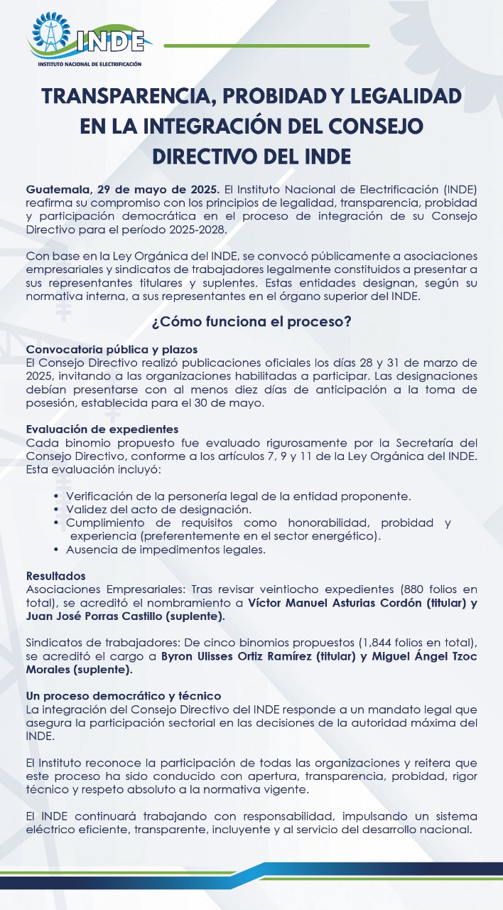 El Instituto Nacional de Electrificación (INDE) reafirma su compromiso con los principios de legalidad, transparencia, probidad y participación democrática en el proceso de integración de su Consejo Directivo para el período 2025-2028.