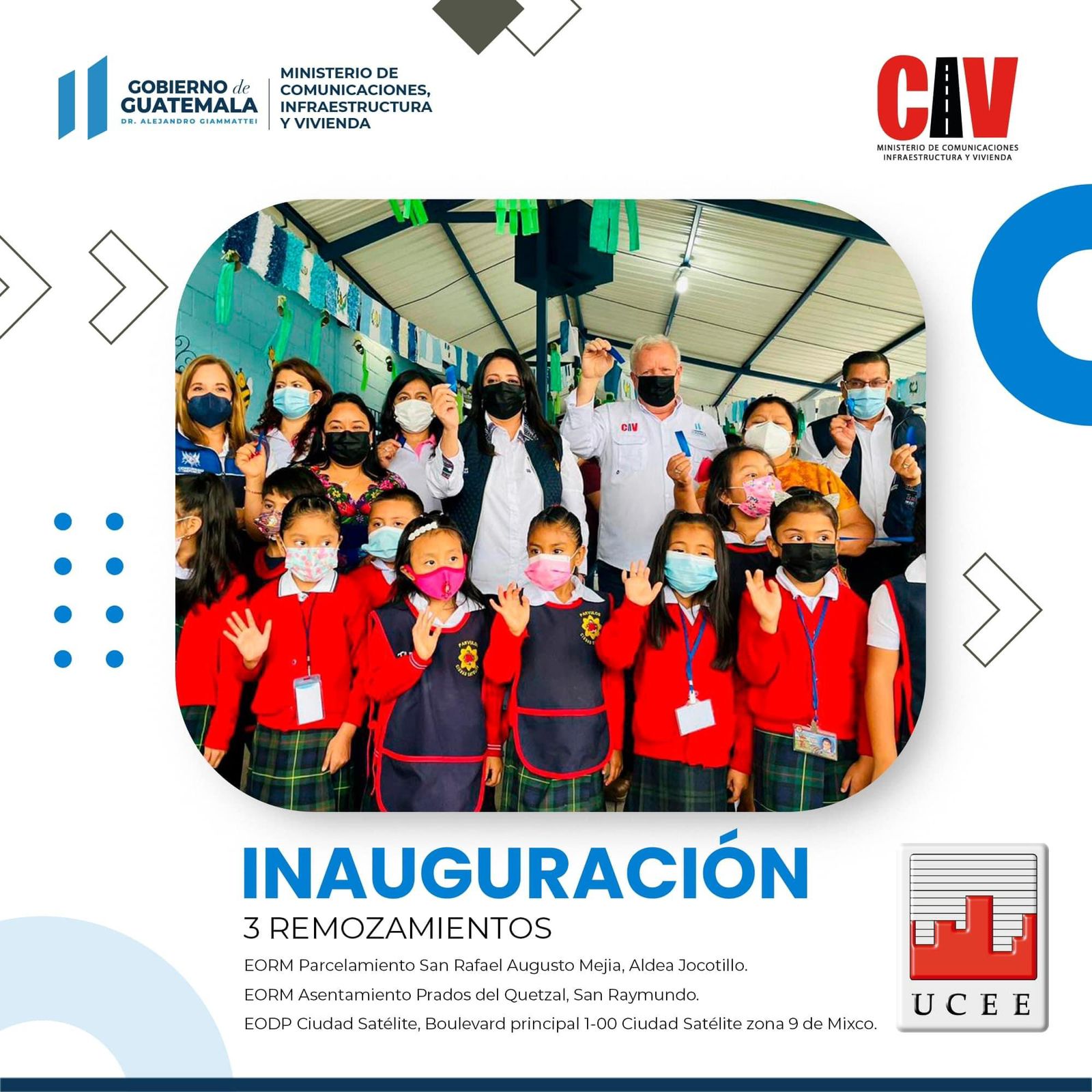 En conjunto con el Ministerio de Educación -MINEDUC-, el Ministerio de Comunicaciones, Infraestructura y Vivienda -CIV- a través de la Unidad de Construcción de Edificios del Estado -UCEE- hizo la entrega de 3 importantes remozamientos en diferentes puntos del departamento de Guatemala.