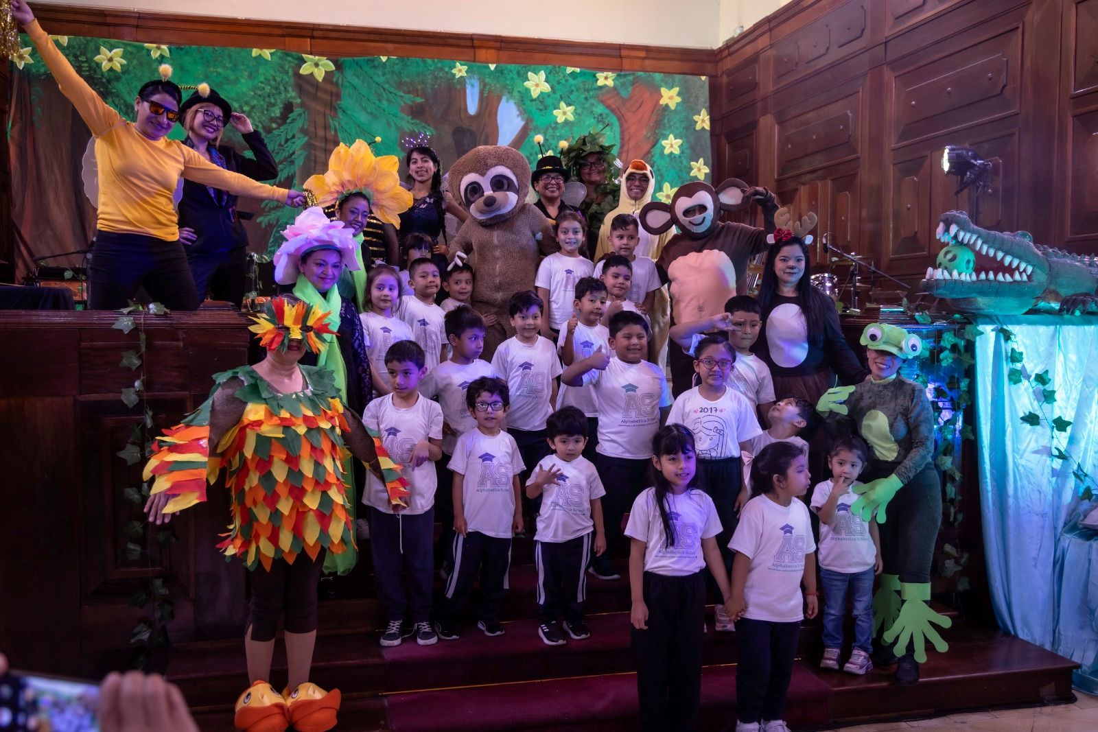 Las maestras de la marimba, con gran creatividad, se disfrazaron de personajes del bosque. Flores, abejas, un monito, un venado, una rana y un simpático perezoso que dormía sobre el contrabajo llenaron el escenario.