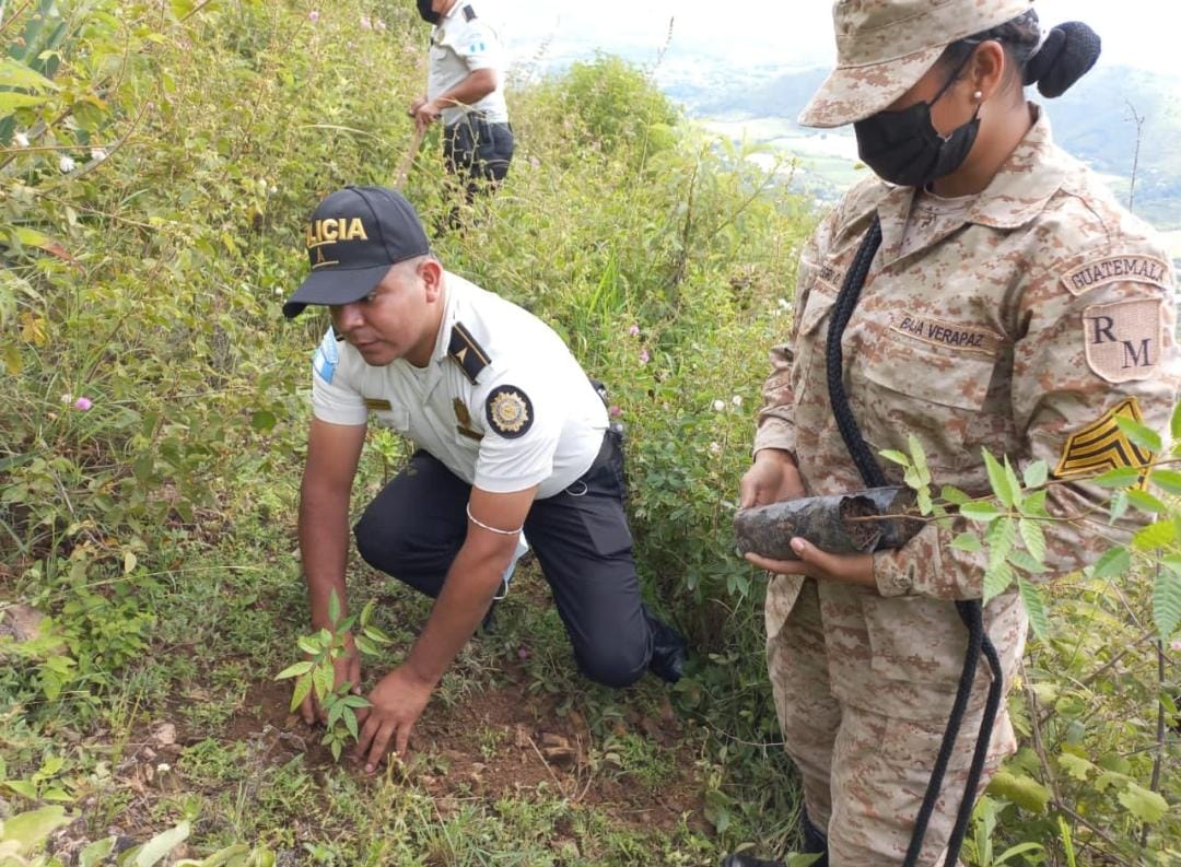 Personal del Servicio Cívico y agentes de la Policía Nacional Civil (PNC), realizó hoy una jornada de reforestación con la coordinación de la Unidad Para la Prevención Comunitaria de la Violencia (UPCV).