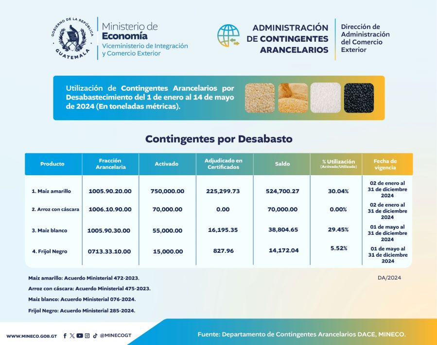 De acuerdo con información de la Administración de Contingentes Arancelarios de la Dirección de Administración del Comercio Exterior (DACE) del Ministerio de Economía, hasta el 14 de mayo último, el monto de contingentes arancelarios por desabasto de frijol negro, maíz blanco, arroz en granza y maíz amarillo asciende a 890,000 toneladas métricas, de las que han sido adjudicadas 242,323.04 toneladas métricas.