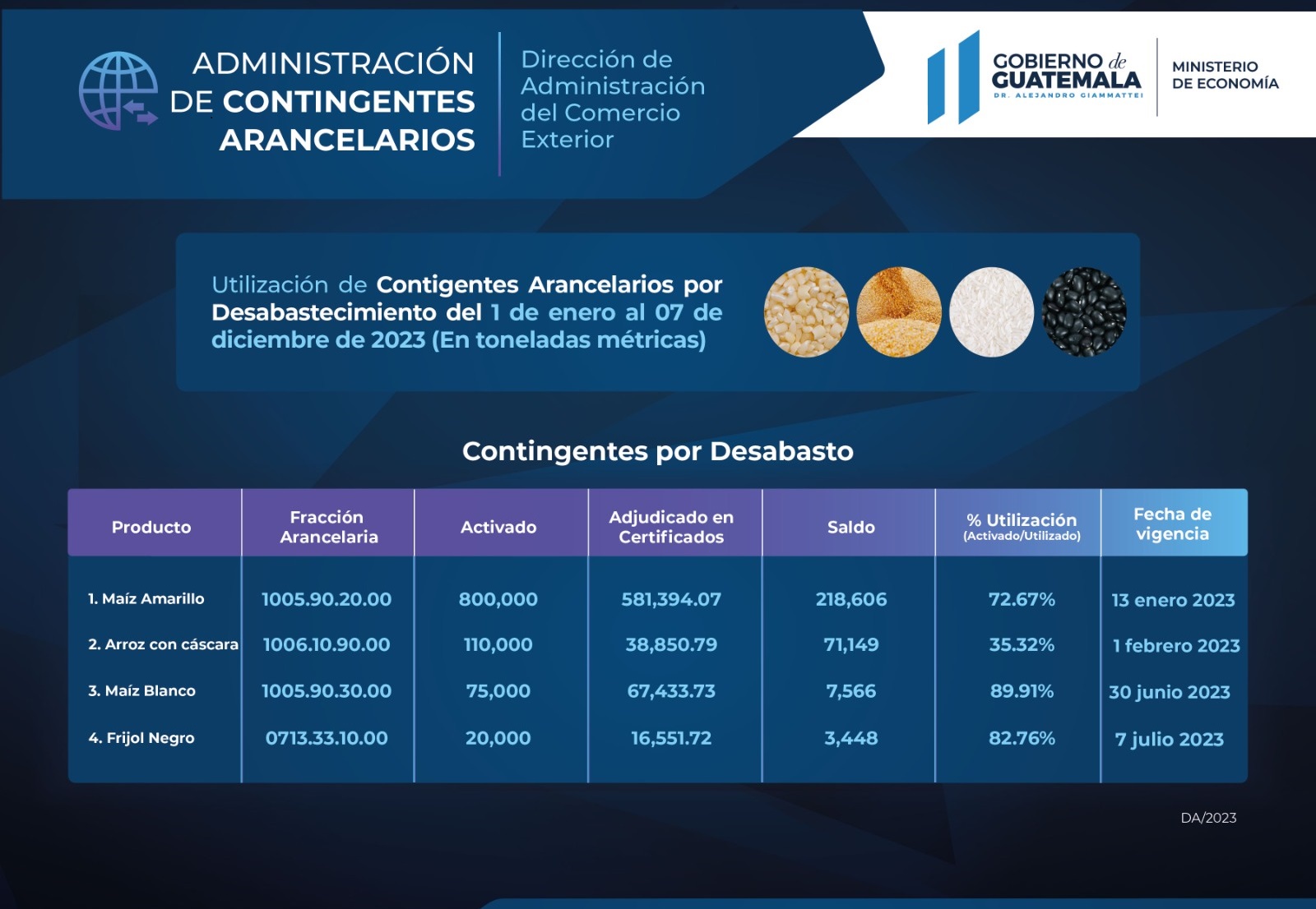 De acuerdo con información de la Administración de Contingentes Arancelarios de la Dirección de Administración del Comercio Exterior (DACE) del Ministerio de Economía, hasta el 7 de diciembre último, se han adjudicado certificados equivalentes a 581,394.07 toneladas métricas (72.67% utilizado) de maíz amarillo del contingente por desabasto autorizado por un total de 800,000 toneladas.