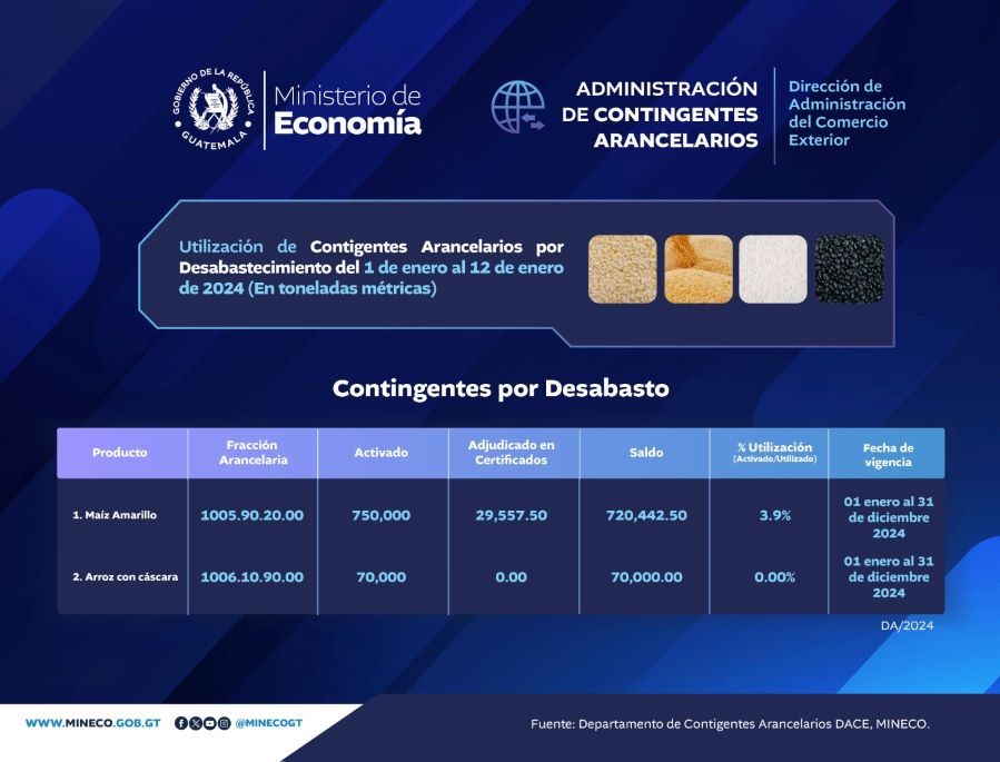 De acuerdo con información de la Administración de Contingentes Arancelarios de la Dirección de Administración del Comercio Exterior (DACE) del Ministerio de Economía, hasta el 15 de enero último, se han adjudicado certificados equivalentes a 29,557.50 toneladas métricas (3.9 % utilizado) de maíz amarillo del contingente por desabasto autorizado por un total de 750,000 toneladas.