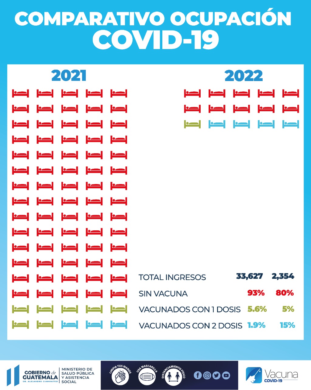 Según estadísticas de Coordinación de la Gestión de Calidad del Viceministro de Hospitales, a la fecha, 2,354 pacientes han sido hospitalizados a causa de COVID-19, de este total, el 80% no tiene ninguna vacuna contra esta enfermedad, el 5% cuenta con la primera dosis y el 15% con esquema completo.