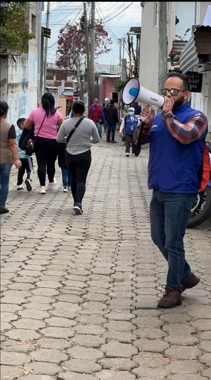 Con megáfono en mano estamos anunciando la llegada de la vacuna contra la polio y el sarampión en el área nororiente del departamento de Guatemala.