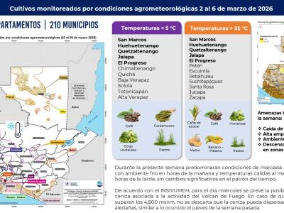 El informe, elaborado por el Centro de Información Estratégica Agropecuaria del Ministerio de Agricultura, Ganadería y Alimentación (MAGA) con base al pronóstico del Instituto Nacional de Sismología, Vulcanología, Meteorología, e Hidrología (INSIVUMEH), identificó doble incidencia de temperaturas altas y bajas en San Marcos, Huehuetenango, Quetzaltenango, Jalapa y Jutiapa.