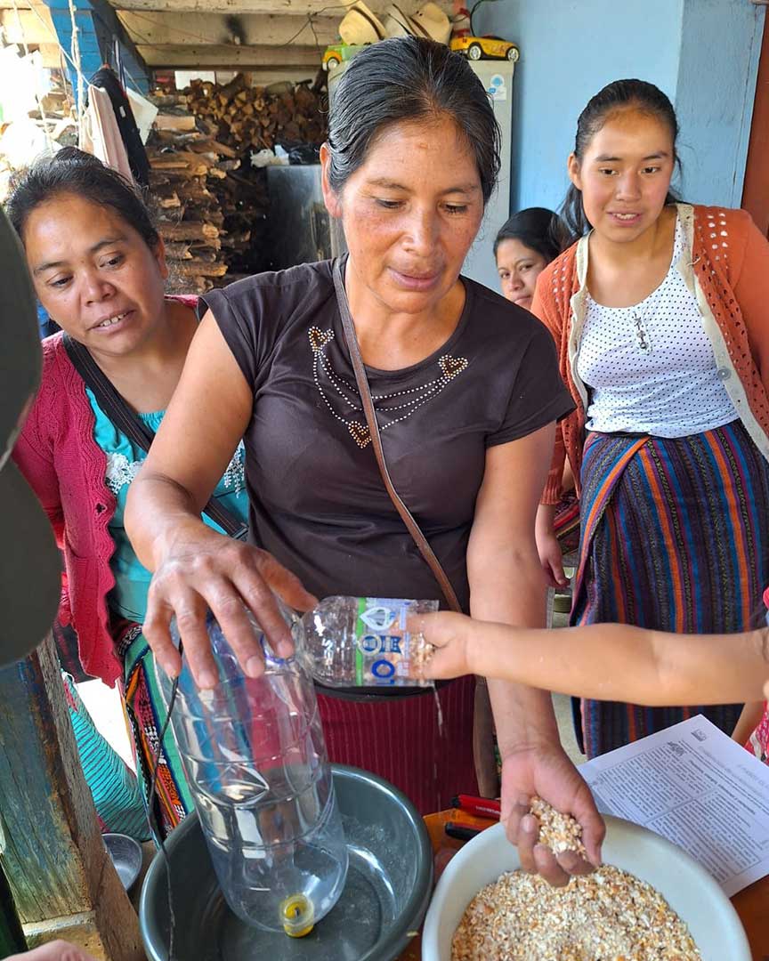 Estos dispositivos se elaboran con materiales fáciles de conseguir, como palanganas o recipientes plásticos, tornillos, empaques y botellas desechables, lo que los hace económicos y accesibles para las agricultoras.