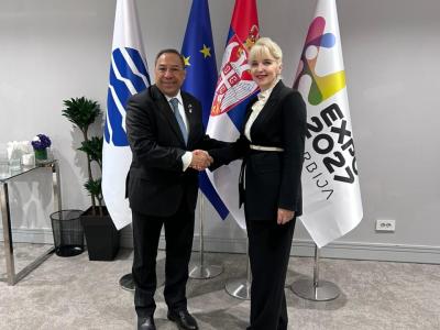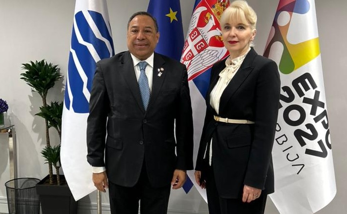 Belgrado, Serbia, 11 de marzo de 2026. El Viceministro de Relaciones Exteriores de Guatemala, Julio Orozco, sostuvo una reunión con la Ministra de Comercio Interno y Externo de Serbia y Comisionada de Expo 2027 Belgrado, Jagoda Lazarević, en el marco de la Segunda Reunión Internacional de Participantes (IPM).